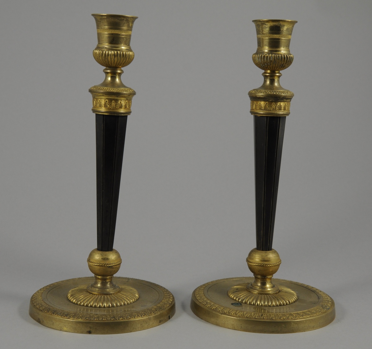 PAIRE de BOUGEOIRS en bronze doré et à patine brune. Binet évasé et godronné en partie inférieure. Fût octogonal fuselé. Base circulaire à décor d'un rang de feuilles d'eau, reliée au fût par un noeud rond orné d'une tresse.