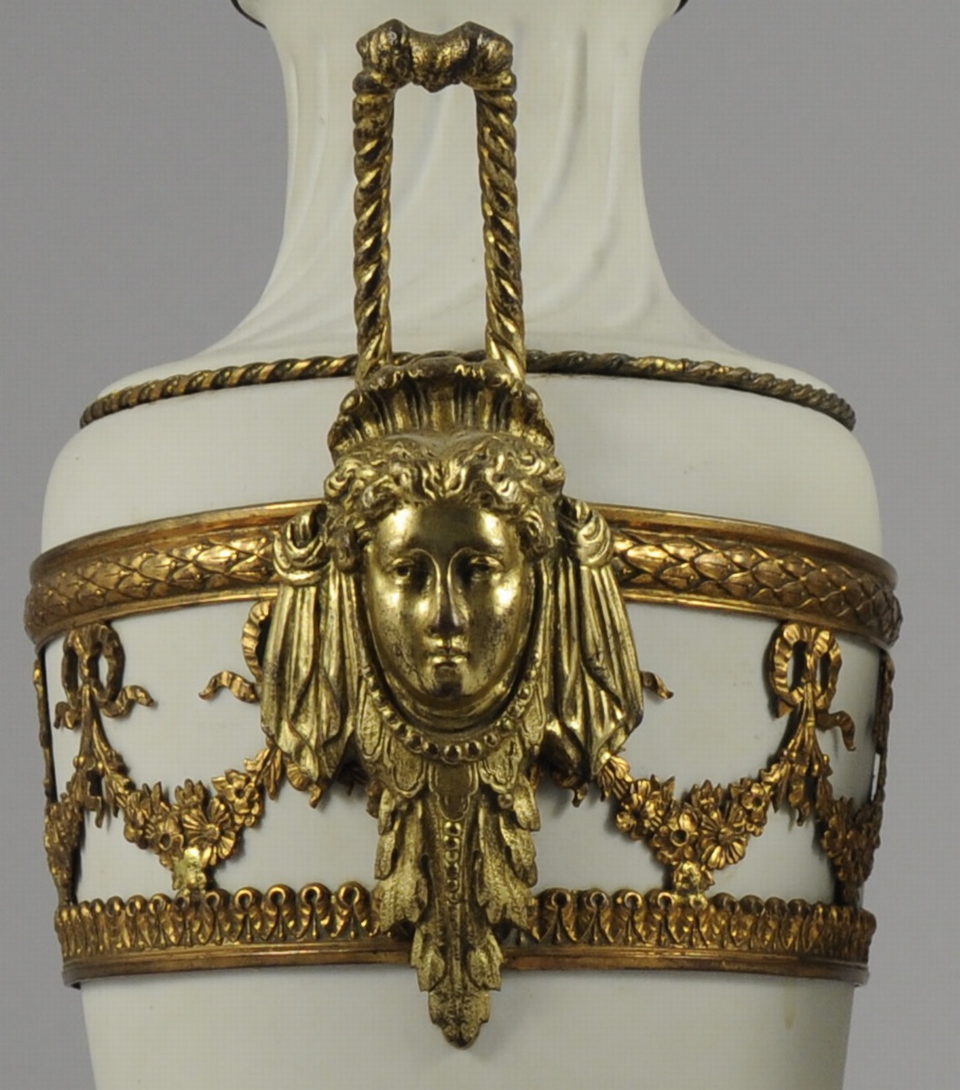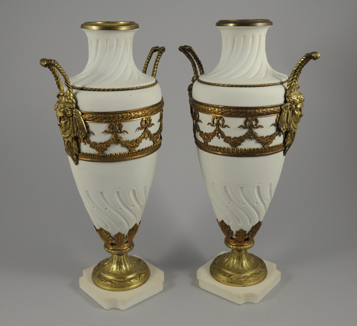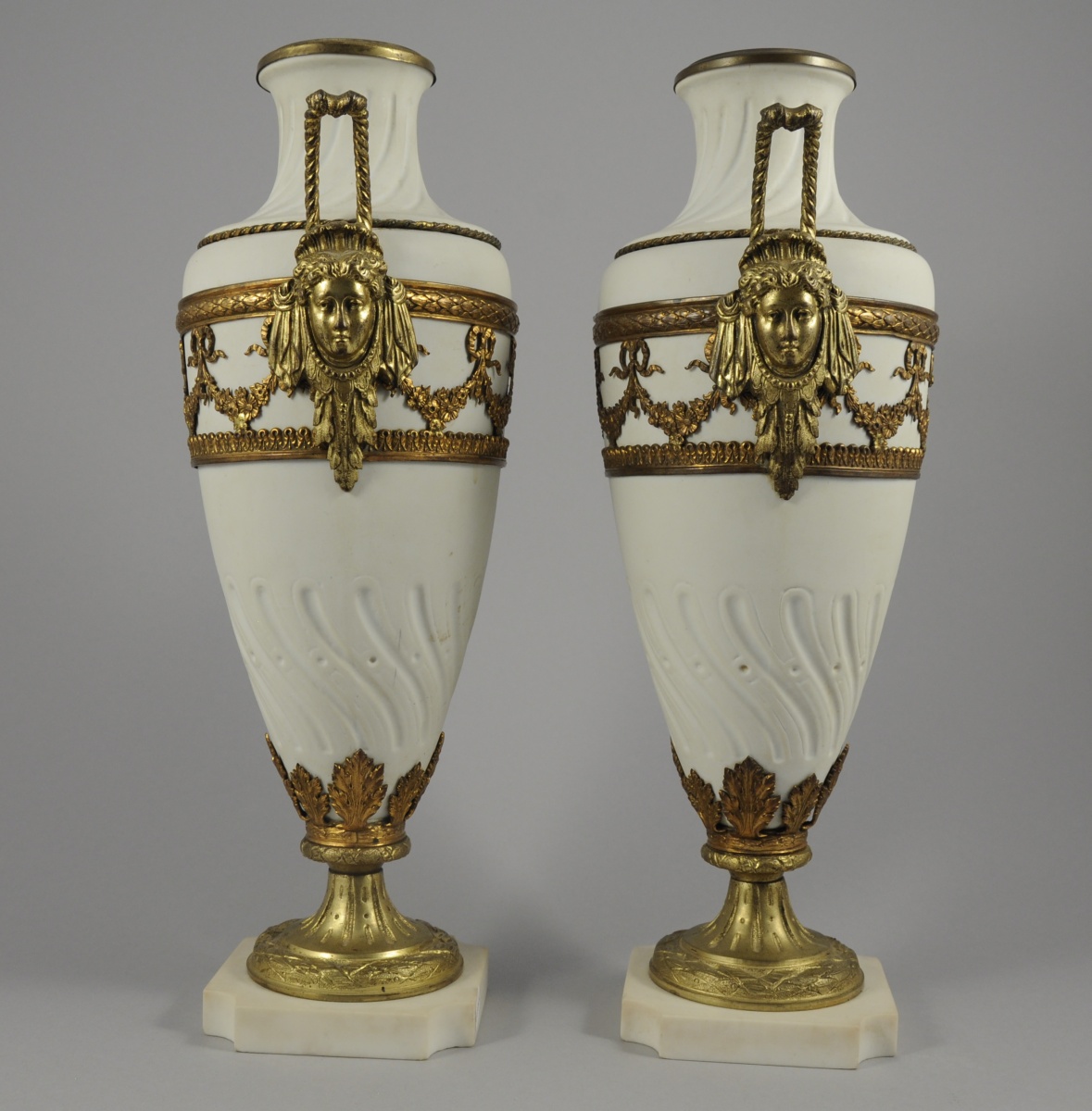 PAIRE de VASES D'ORNEMENT en biscuit et monture de régule doré, en forme d'amphores. Col à cannelures torses et partie inférieure à godrons séparés par de petits cercles. La panse est cerclée d'une frise de guirlandes de fleurs retenues par des noeuds de rubans, entre un tore de lauriers et une bande de feuilles d'eau. De part et d'autre, visages de femmes à la base des anses. Pied à décor de lauriers enrubannés et de larges feuilles.