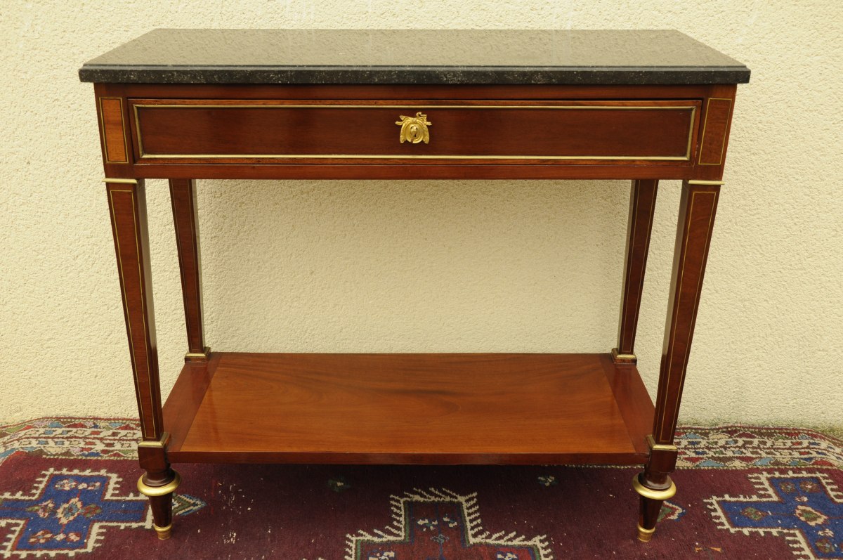 CONSOLE en acajou et placage d'acajou. Elle ouvre par un tiroir en ceinture. Pieds gaines se terminant en toupies, réunis par une tablette d'entrejambe. Décor de filets de laiton et d'ébène incrustés.
