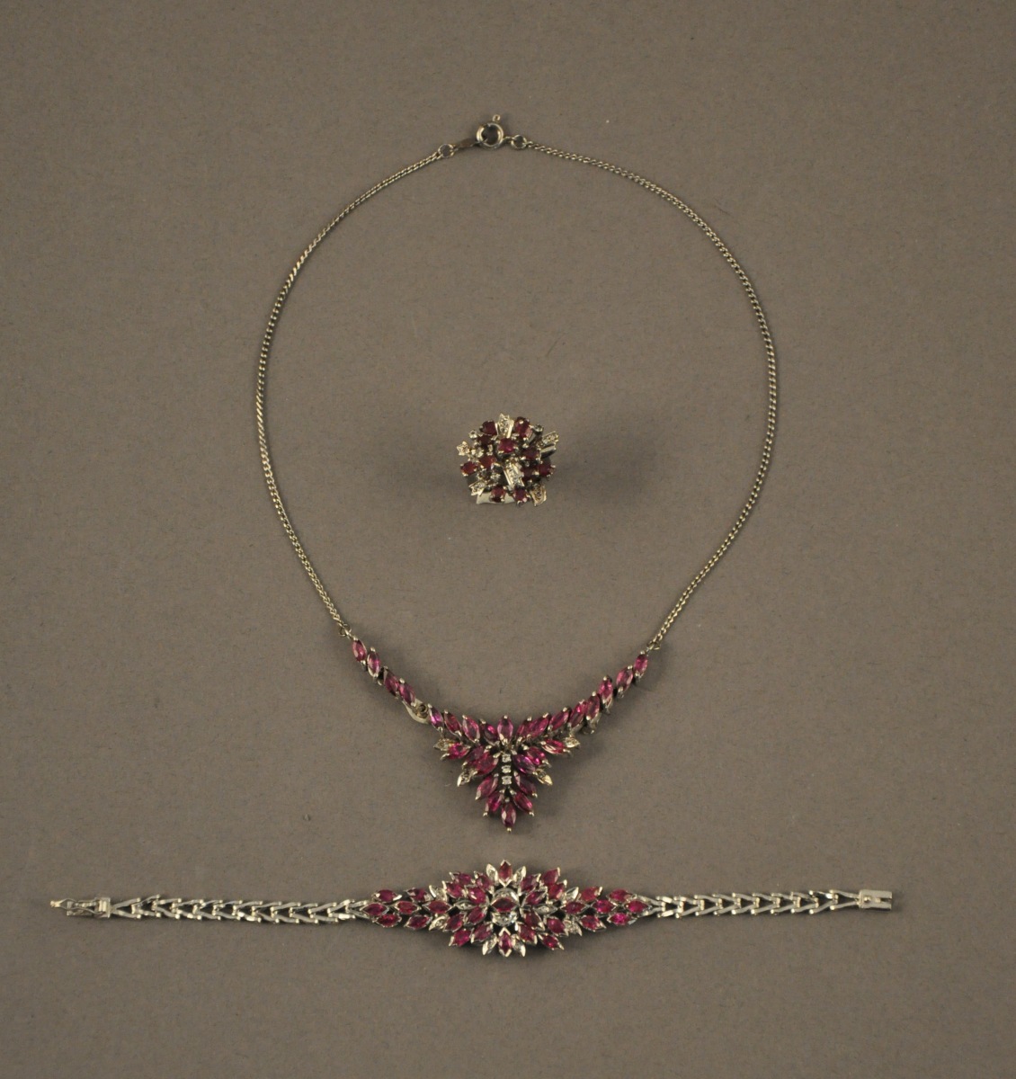 Petite PARURE en argent sertie de rubis facetés de forme navette et petites pierres d'imitation blanches. Elle comprend: un collier articulé à motif feuillagé (accident) et un bracelet de même décor.