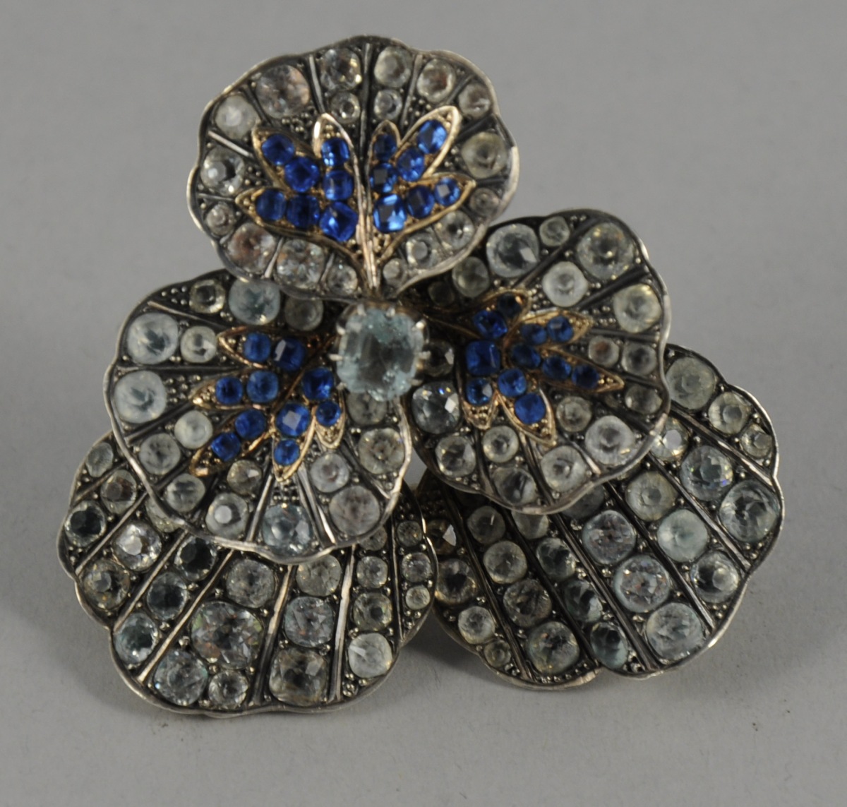 BROCHE en forme de pensée en strass facetté blanc et bleu.