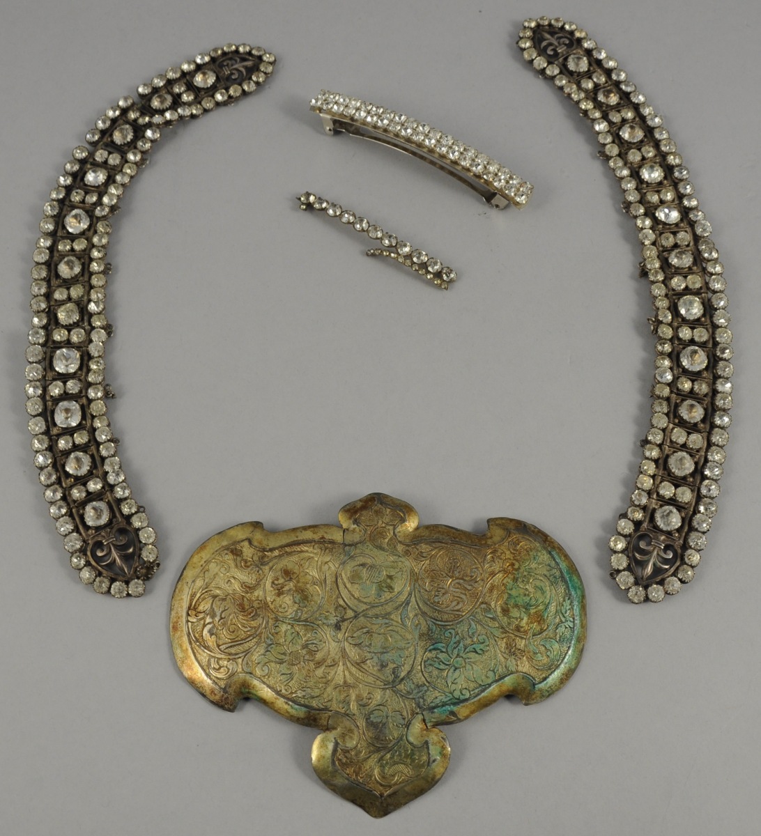 Joint: un élément en métal composé de onze strass, une barette à cheveux en métal et strass, et une plaque décorative en métal argenté et doré de forme polylobée à décor gravé de volutes et fleurs (poids brut 89,2 g).