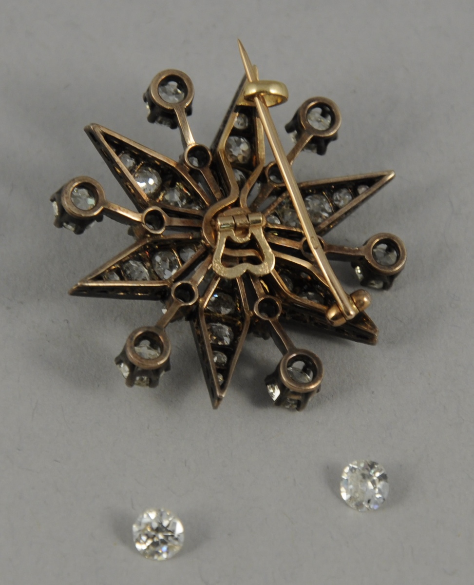BROCHE ÉTOILE en or blanc pavée de diamants, dont le principal au centre est d'environ 0,50 carat. Entourage de 6 diamants d'environ 0, 20 chacun.