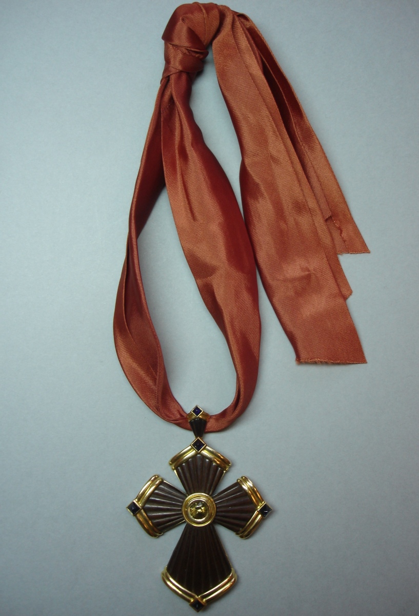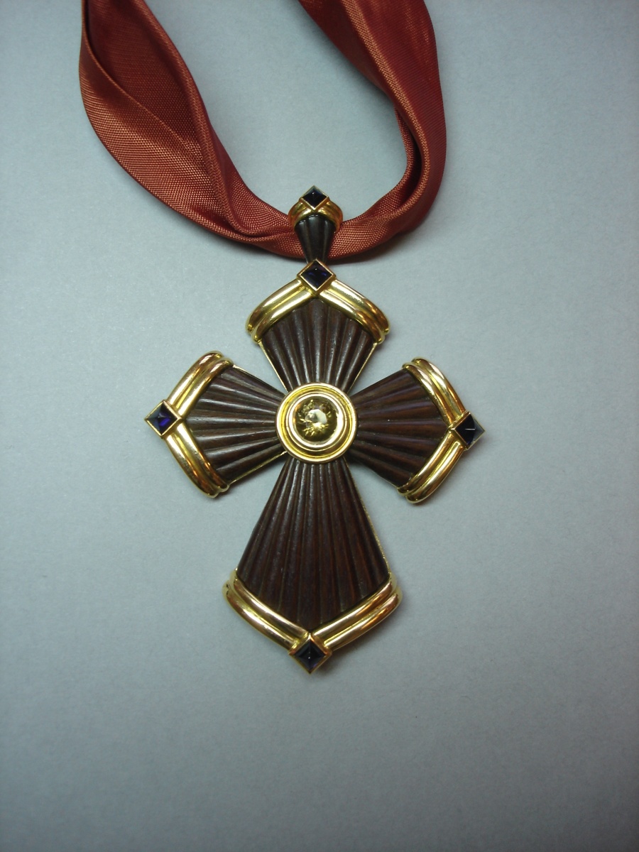COLLIER RUBAN en soie supportant en pendentif une croix en bois brun gravé de cannelures, ornée au centre d'un quartz enfumé serti-clos et de saphirs cabochons à pans aux extrémités, la monture en or jaune.