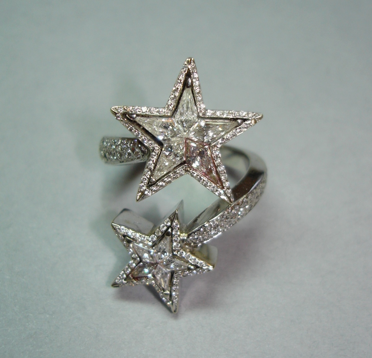BAGUE "TOI ET MOI" composée de deux motifs "étoiles" sertis de diamants taillés en losange dans des entourages de diamants ronds, la monture en or gris partiellement pavée de petits diamants.