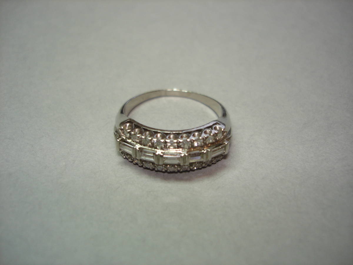 BAGUE sertie au centre de cinq diamants de forme baguette dans un entourage de diamants taillés en 8/8.