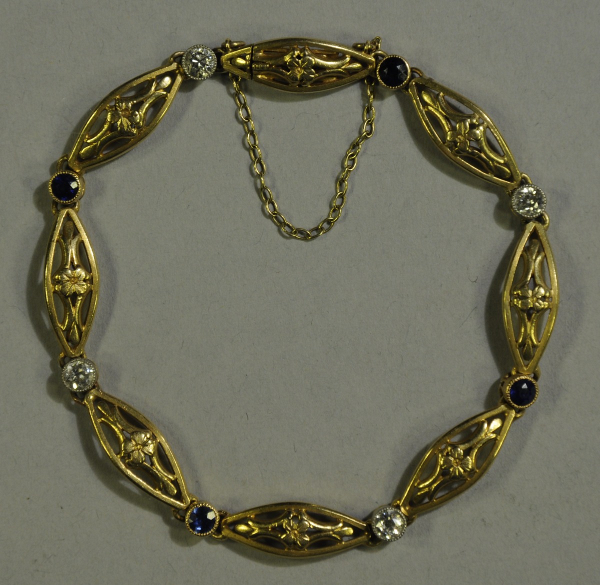 BRACELET souple en or jaune. Il se compose de huit maillons de forme étirée et ornés en leur centre d'une fleur, alternant avec quatre brillants et quatre saphirs. Avec chaîne de sûreté. Poinçon tête d'aigle.