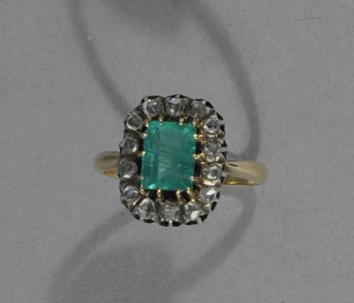 BAGUE en or jaune sertie en son centre d'une émeraude de taille émeraude, dans un entourage de 14 petits diamants de taille ancienne.