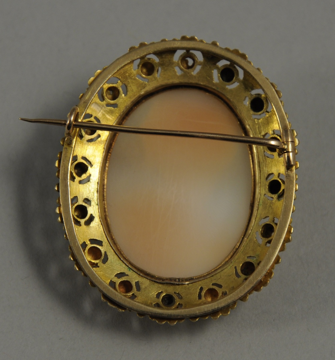 CAMÉE coquille figurant le dieu Apollon avec sa lyre, monté en broche or jaune à décor de petites sphères sur un fond en granulation.