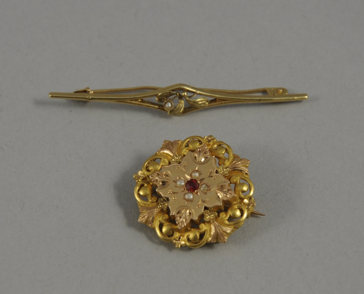 BROCHE en or jaune à décor de fleurons, d'entrelacs et de fleurettes, ornée en son centre d'une pierre rouge et quatre petites perles. Poinçon tête d'aigle.