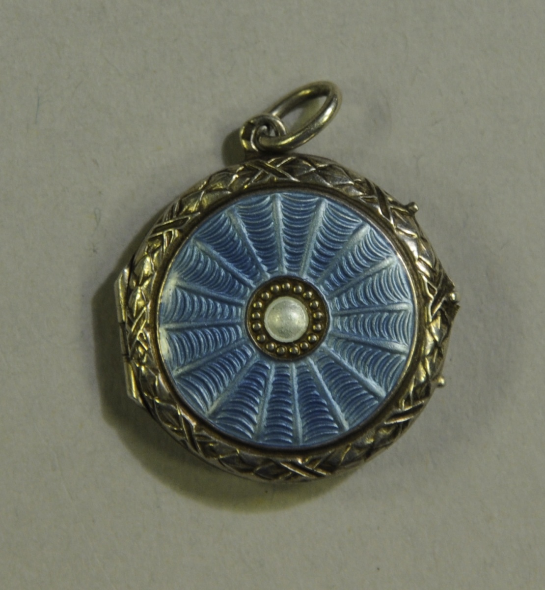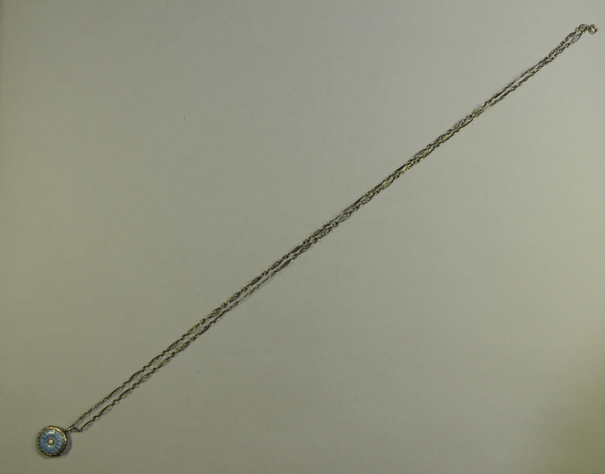 Joint: Broche en or jaune ornée d'une fleur (2 g.), et chaîne en argent à maillons ovales décorés en leur centre d'un motif en forme de S, avec médaillon formant porte-photo à décor émaillé bleu et blanc. (poids brut: 16 g. Long. 95 cm.)