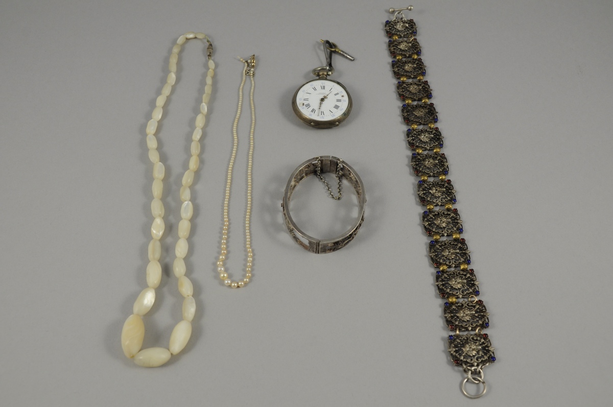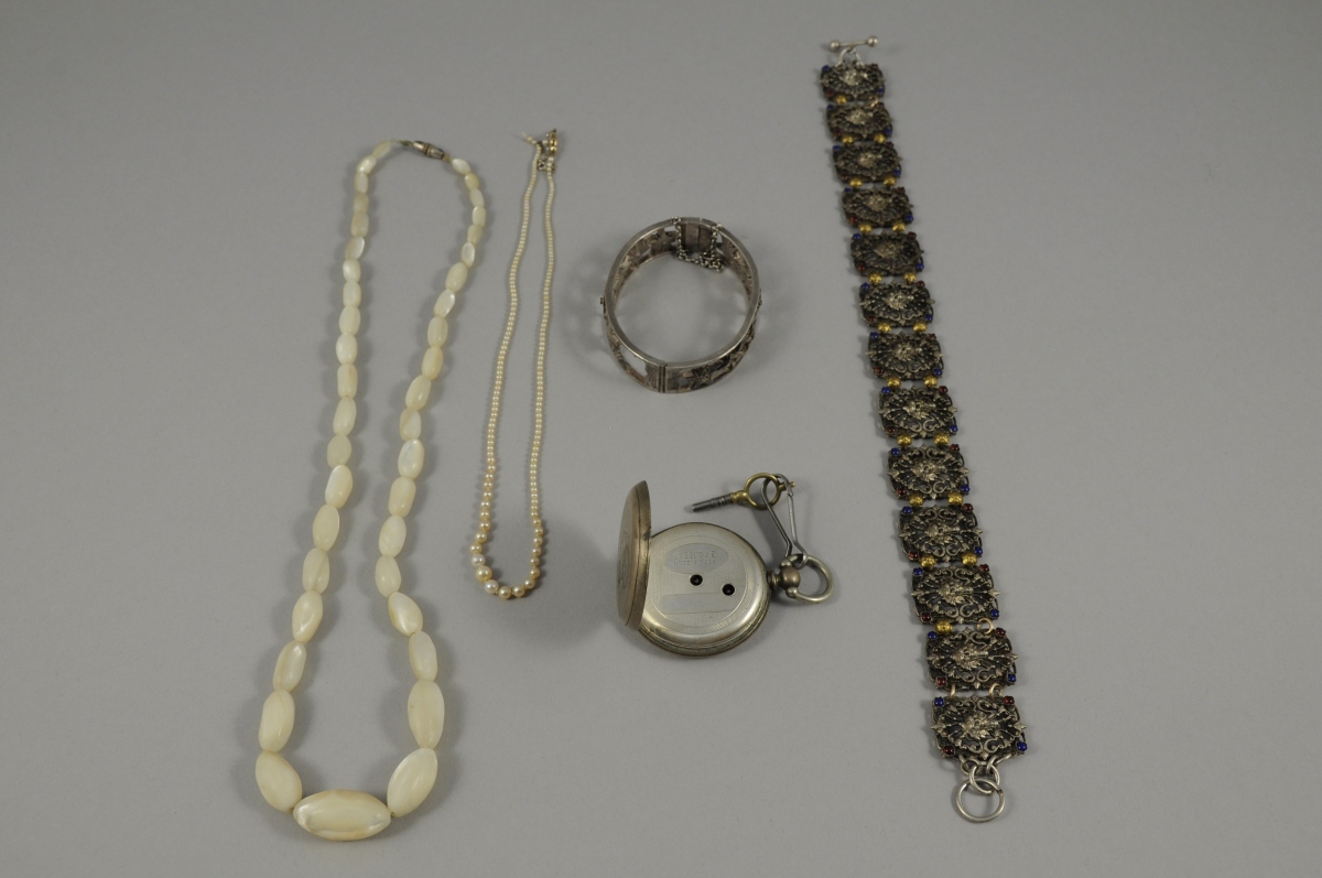 -un bracelet de style néo-Renaissance orné de mufles de lions et de perles de verre rouges et bleues, un collier en nacre, une montre de gousset à remontoir à clé en métal de Descroix à Châteaurenault, un collier de perles. (accidents, manques)