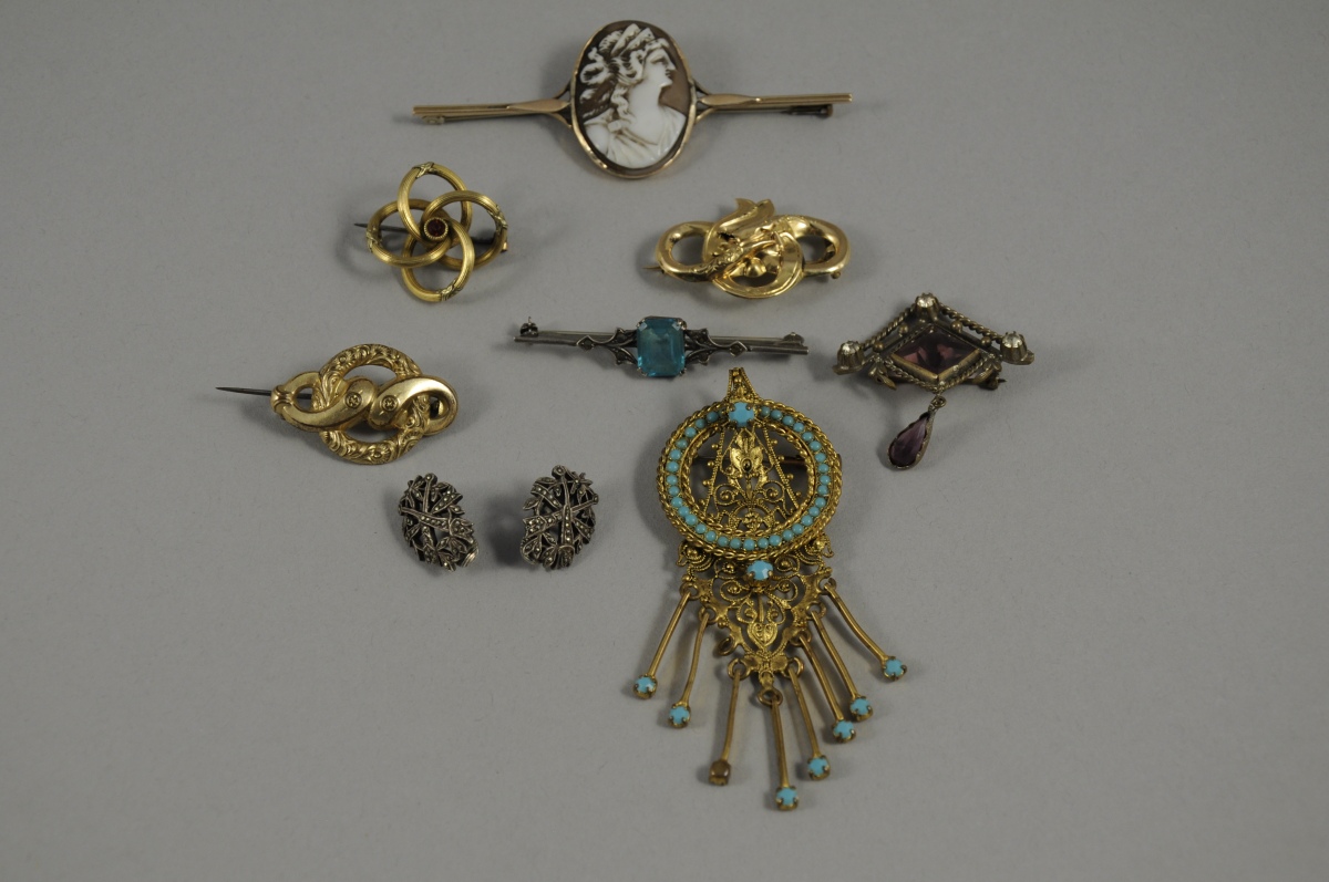 LOT comprenant: un camée coquille monté en broche et figurant une femme de profil, une paire de clips d'oreilles en argent ornés d'un flambeau et d'un carquois et décorés de zirconium, une broche ornée de verres violets, une broche ornée d'un verre bleu, deux broches dorées à motifs d'entrelacs, une broche d'inspiration orientale décorée verres bleus, une broche dorée à décor d'entrelacs.