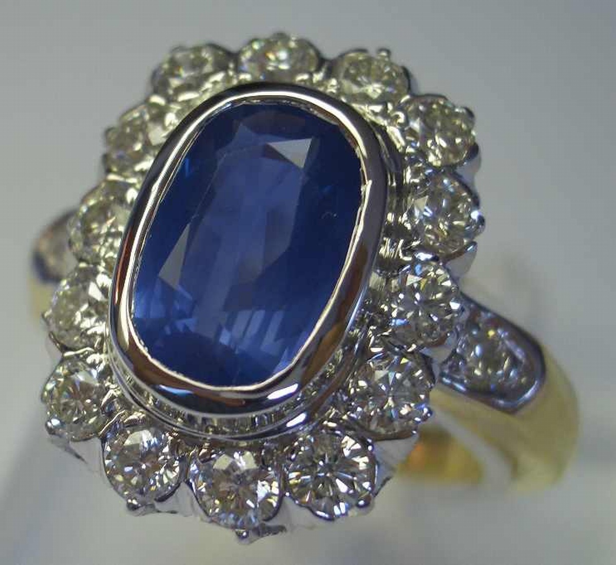 BAGUE en or gris, ornée en son centre d'un saphir de Ceylan de 2,80 carats en serti clos, dans un entourage de quatorze diamants de taille moderne et de deux autres diamants sur l'anneau, pour un carat environ.