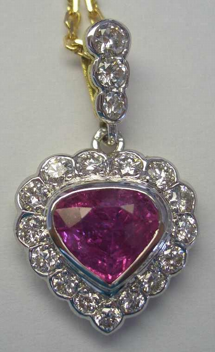 PENDENTIF CŒUR en or gris, orné en son centre d'un saphir rose d'environ 2,30 carats en serti clos, entouré de quinze diamants de taille moderne. Bélière agrémentée de trois autres diamants. Chaîne en or jaune à maille forçat.