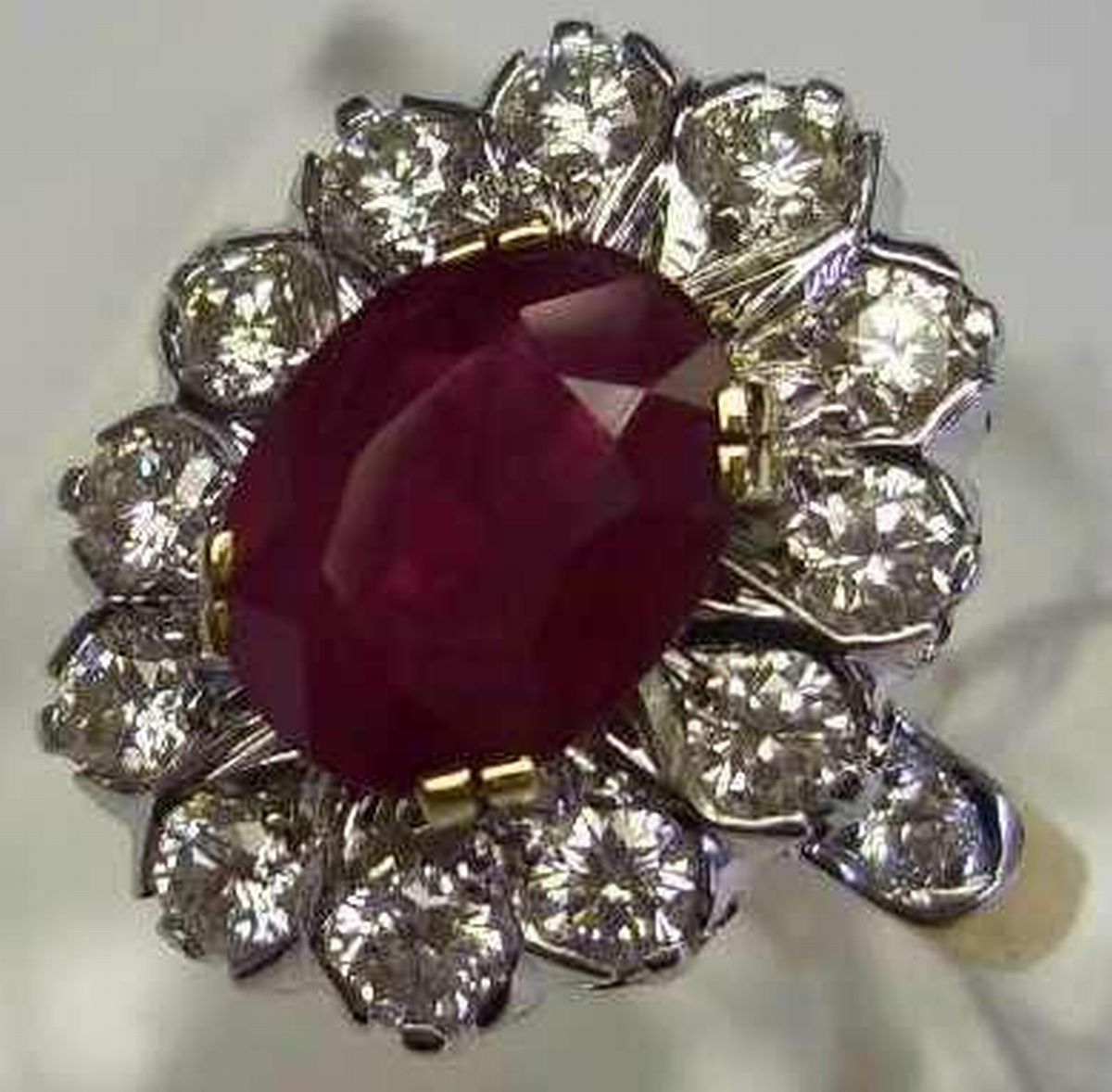 BAGUE ovale en or gris sertie d'un rubis probablement Birman d'environ 2,80 carats. Il est entouré de douze diamants de taille moderne, plus deux autres sur l'anneau, pour environ 1,20 carats.