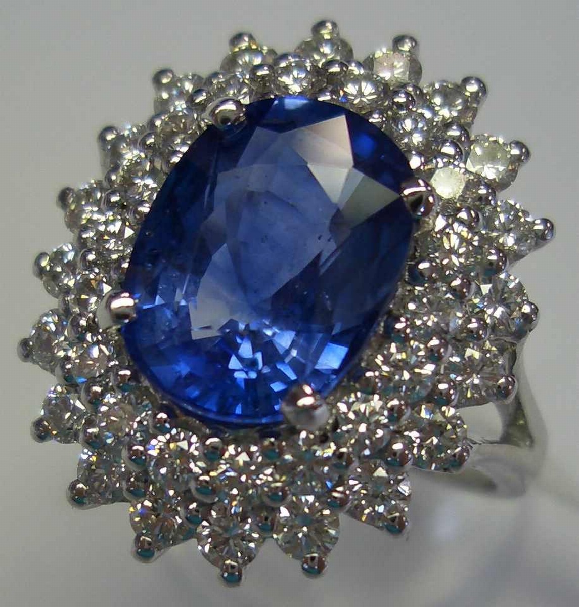BAGUE ovale en or blanc sertie d'un saphir de 4,65 carats, dans un entourage double de 38 diamants de taille moderne, pour 1,40 carat.