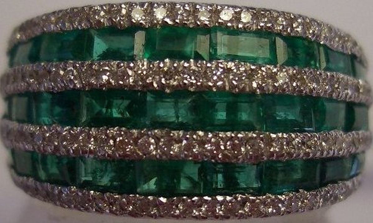 BAGUE jonc en or blanc, ornée sur quatre rangs de 112 diamants blancs de taille moderne pour 0,35 carats environ, alternant avec trois rangs de 30 émeraudes calibrées, pour 2,15 carats.