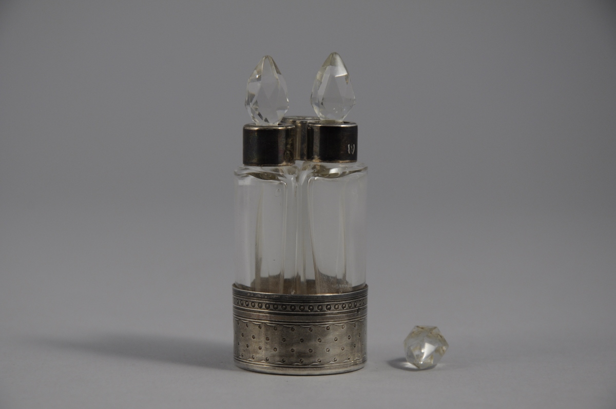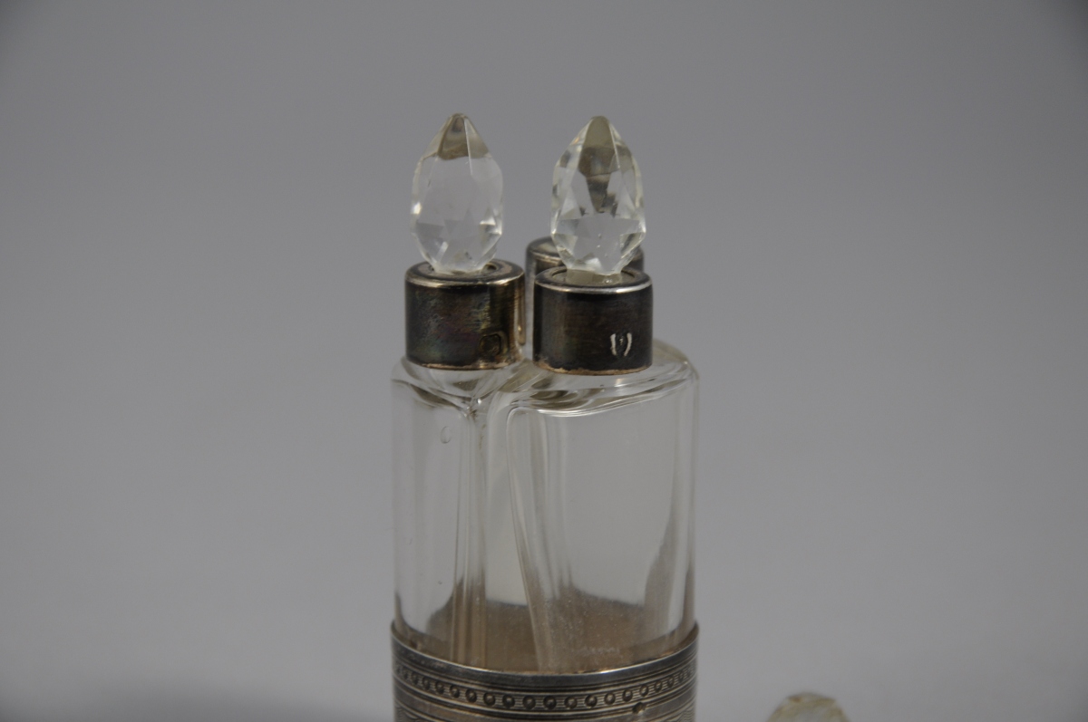 NÉCESSAIRE à SELS cylindrique composé de trois flacons en cristal réunis par une bague en argent à décor d'un semi de pois sur un fond guilloché. Bouchons à facettes. Montures en argent.