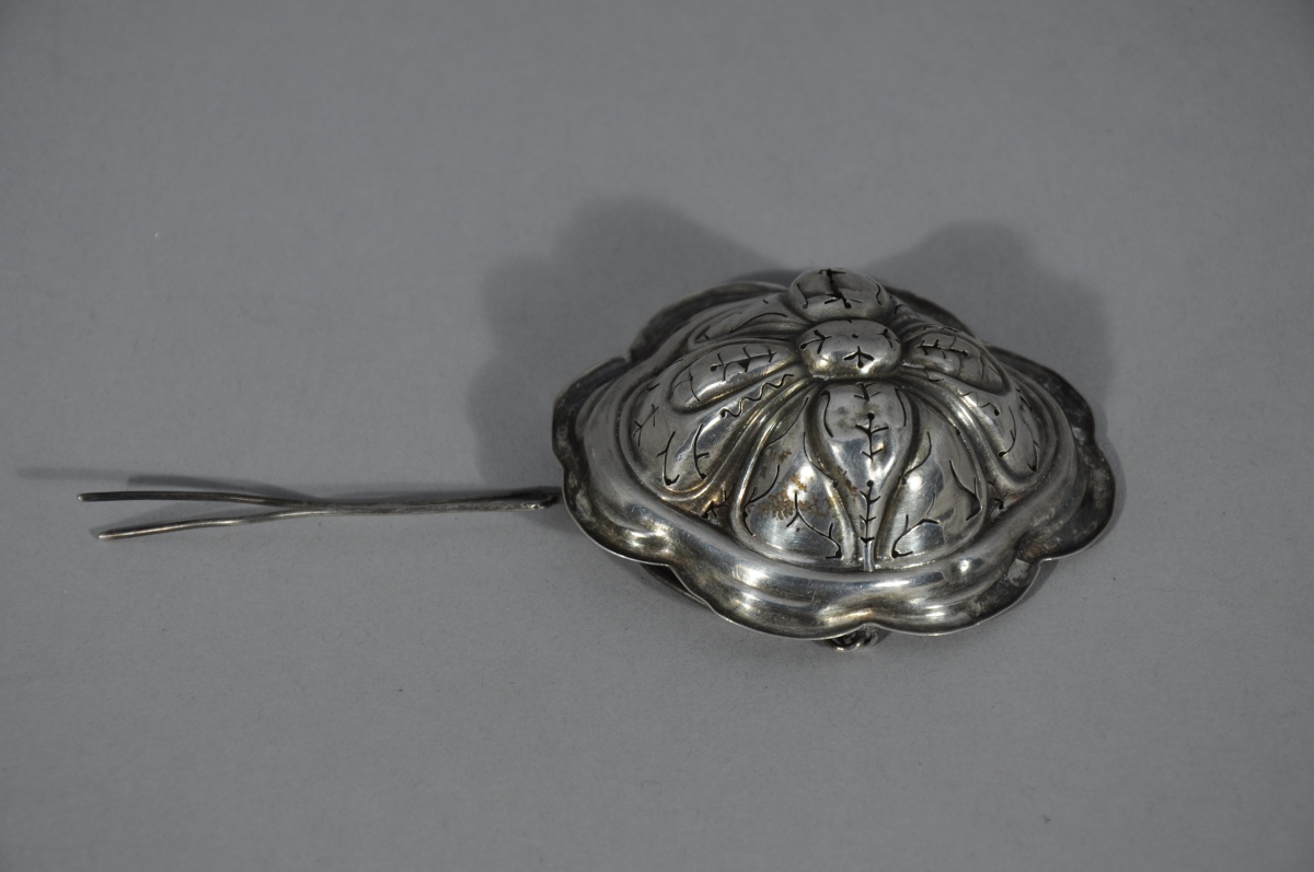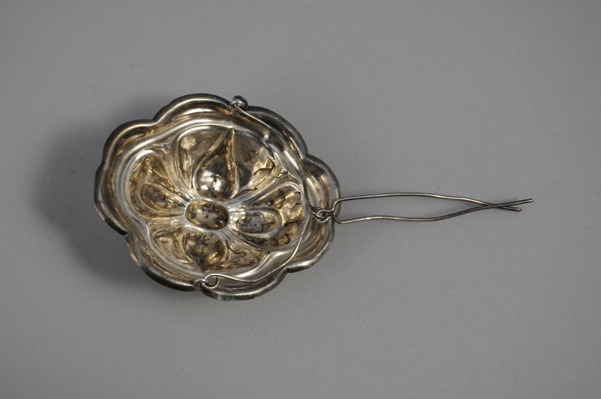 PASSOIRE de théière en argent de forme polylobée à motif d'une fleur à quatre pétales.