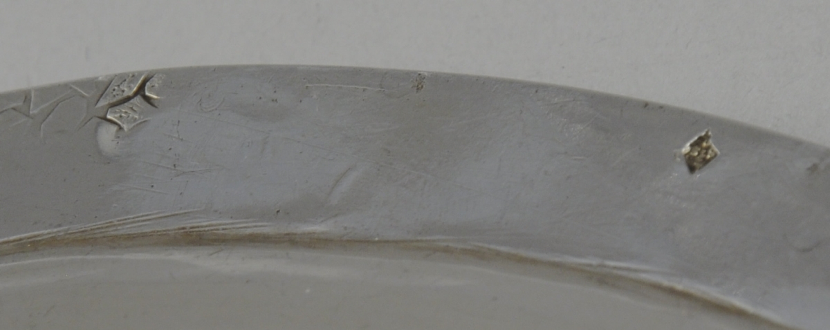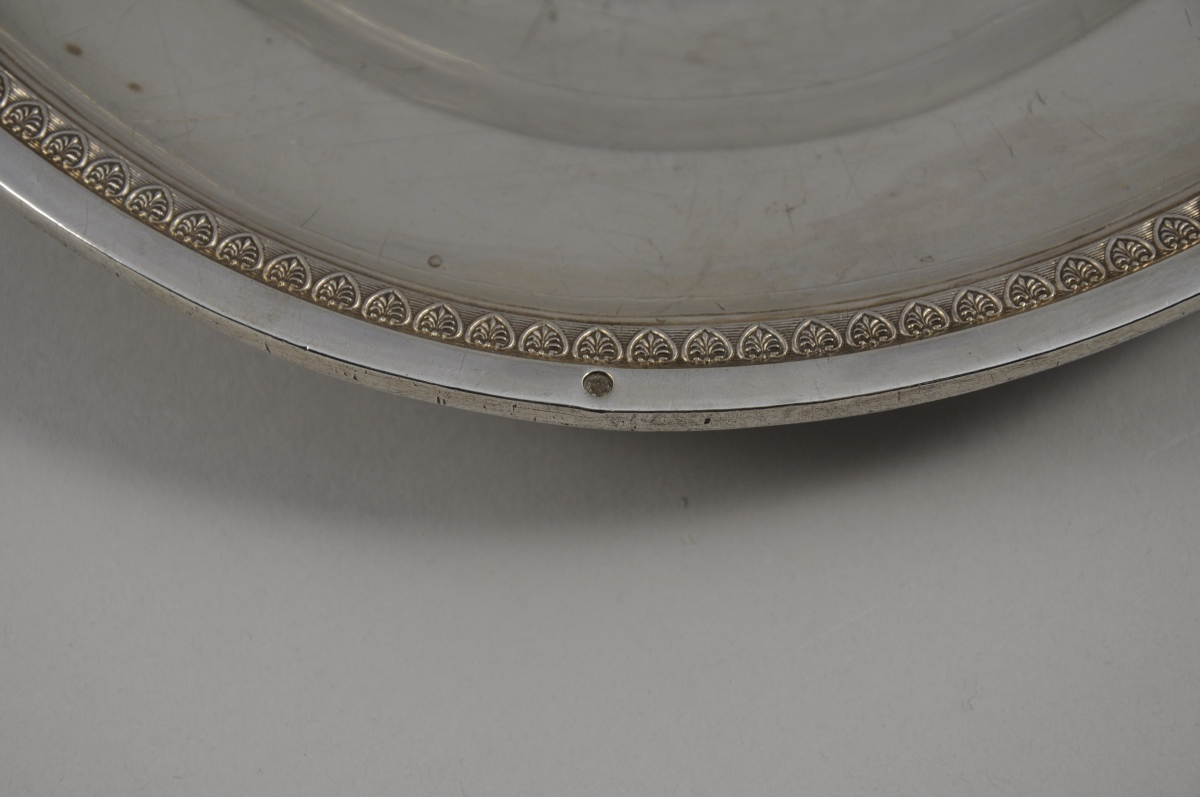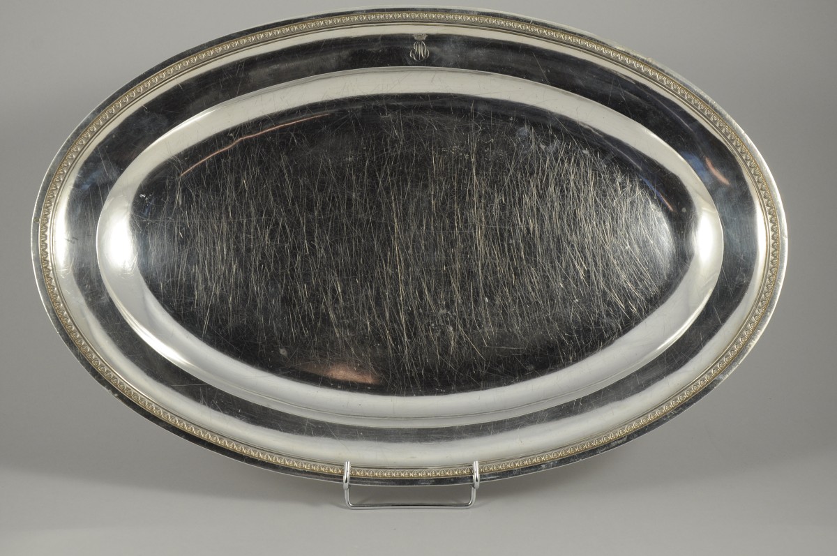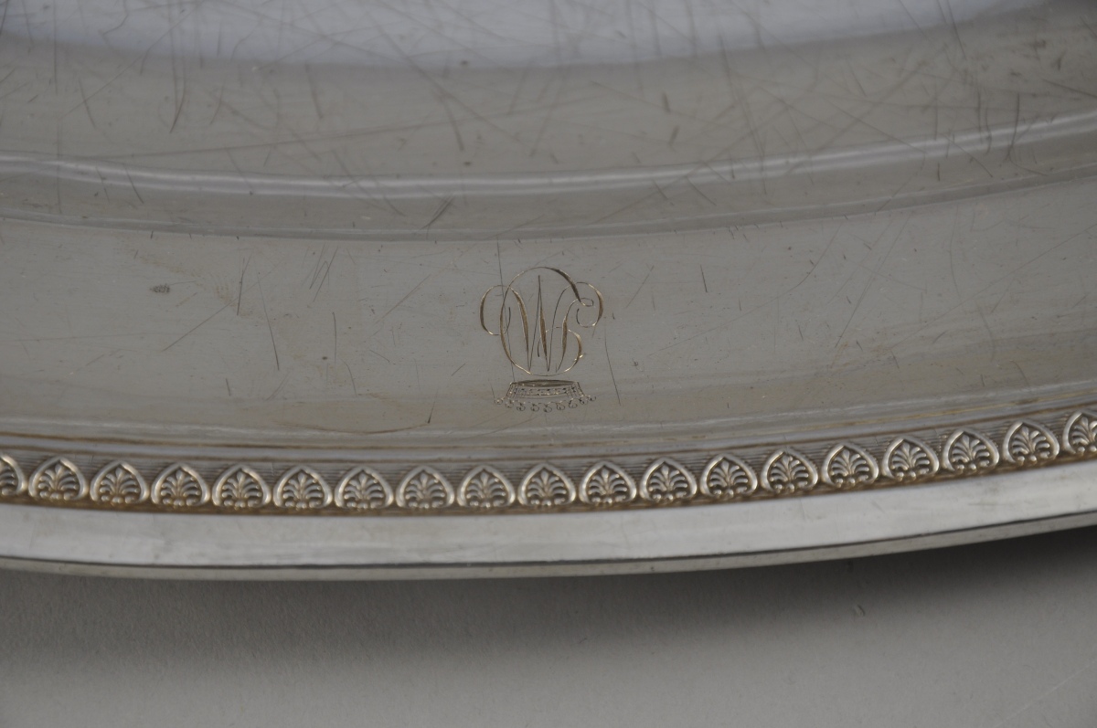 Grand PLAT de présentation en argent de forme ovale orné d'une frise de palmettes. Poinçon Vieillard (1818-1839), orfèvre Sixte-Simon Rion, poinçon utilisé de 1824 à 1834.