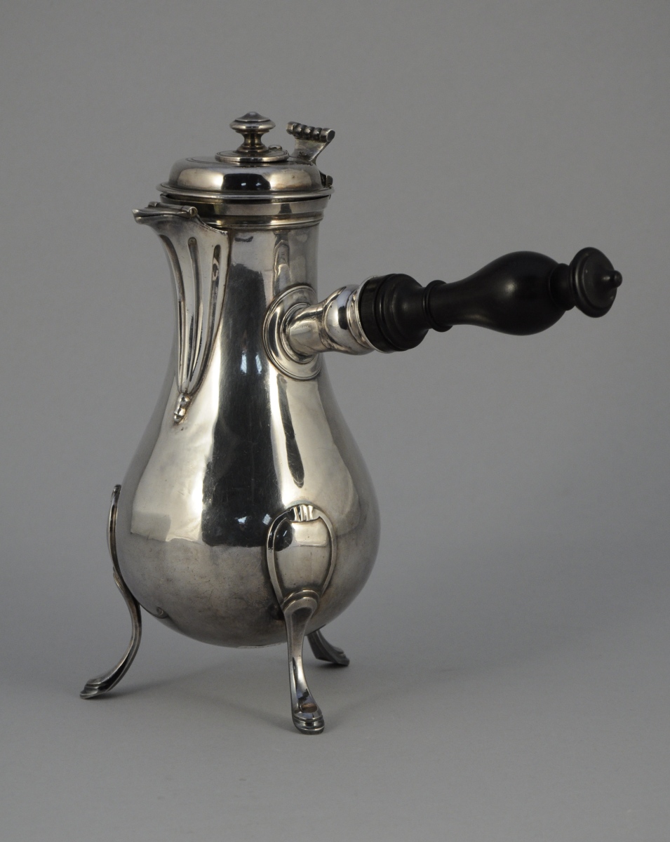 CHOCOLATIÈRE  tripode en argent de forme balustre. Le corps...