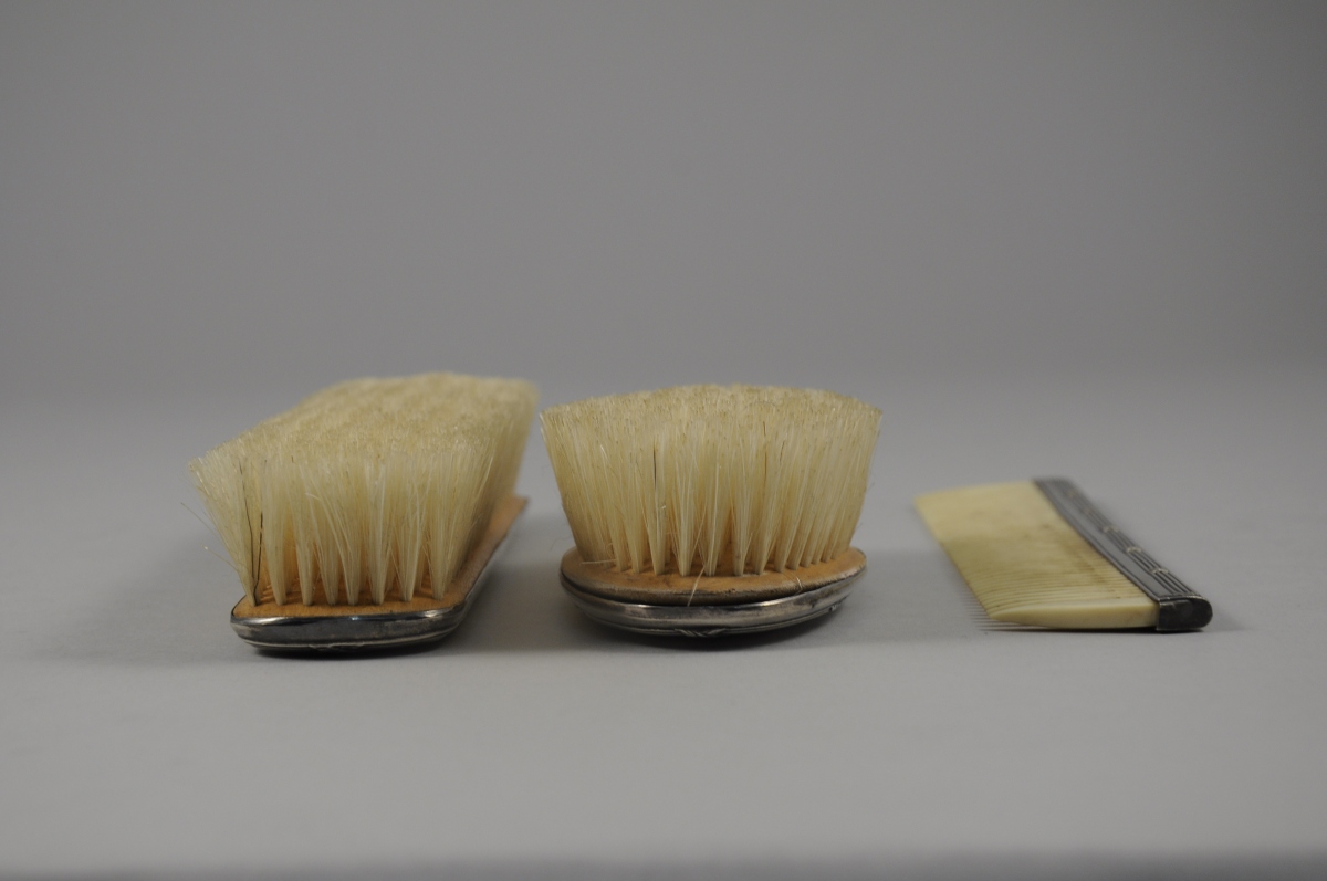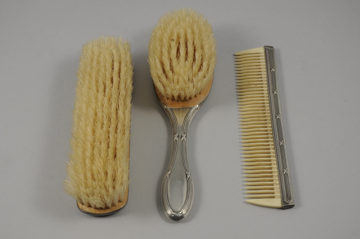 NÉCESSAIRE de TOILETTE comprenant un peigne et deux brosses, dont une rectangulaire et l'autre ovale avec un manche. Décor de joncs rubannés. Argent, poinçon au charançon. Poids brut: 230 g.