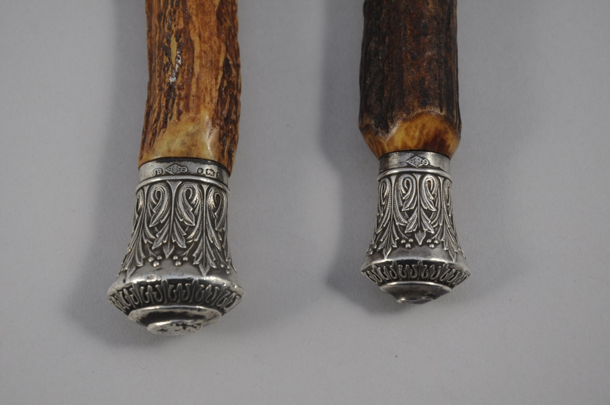 SERVICE à DÉCOUPER. Manches en bois de cerf. Viroles et bouterolles en argent, à décor néoclassique de palmes.
