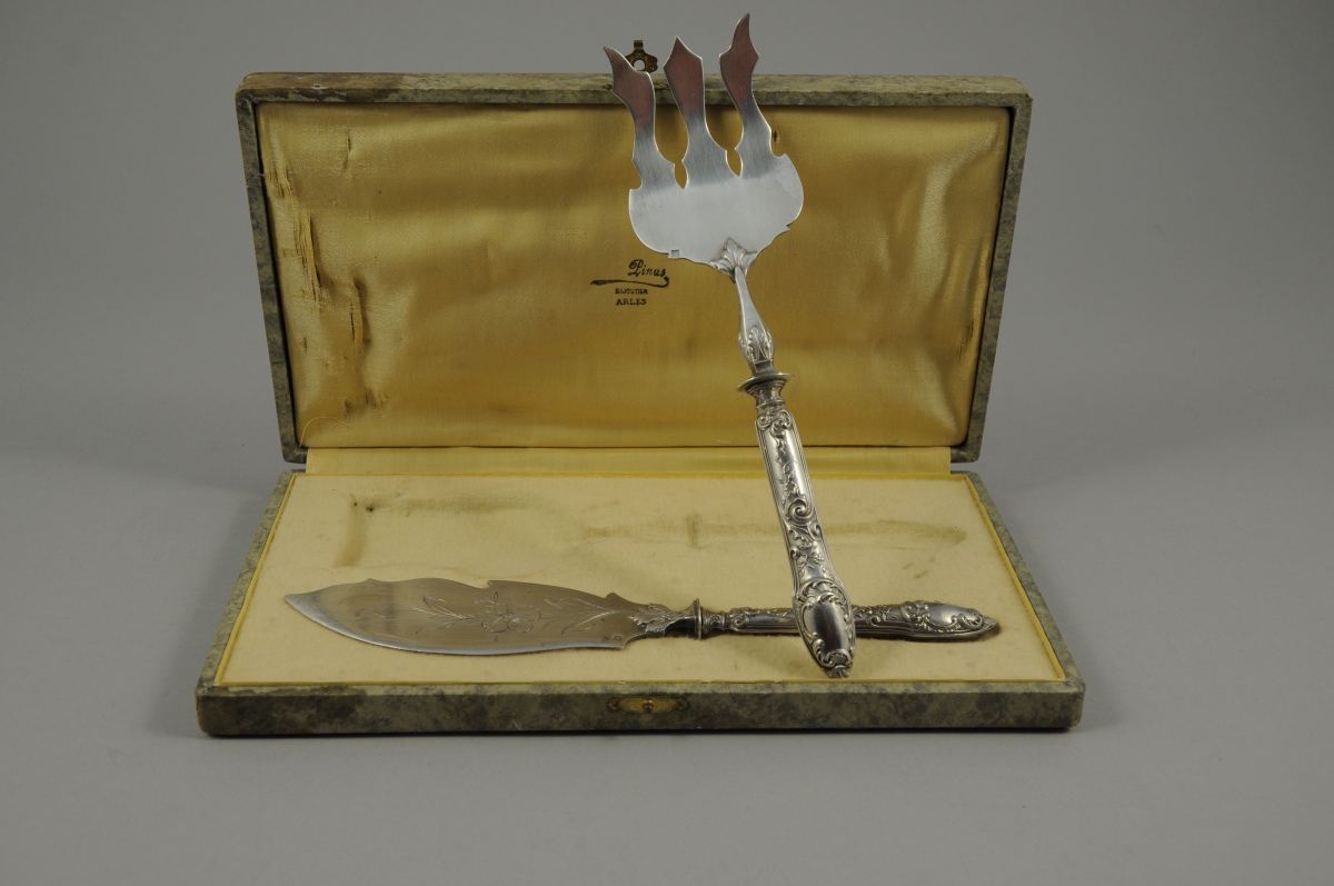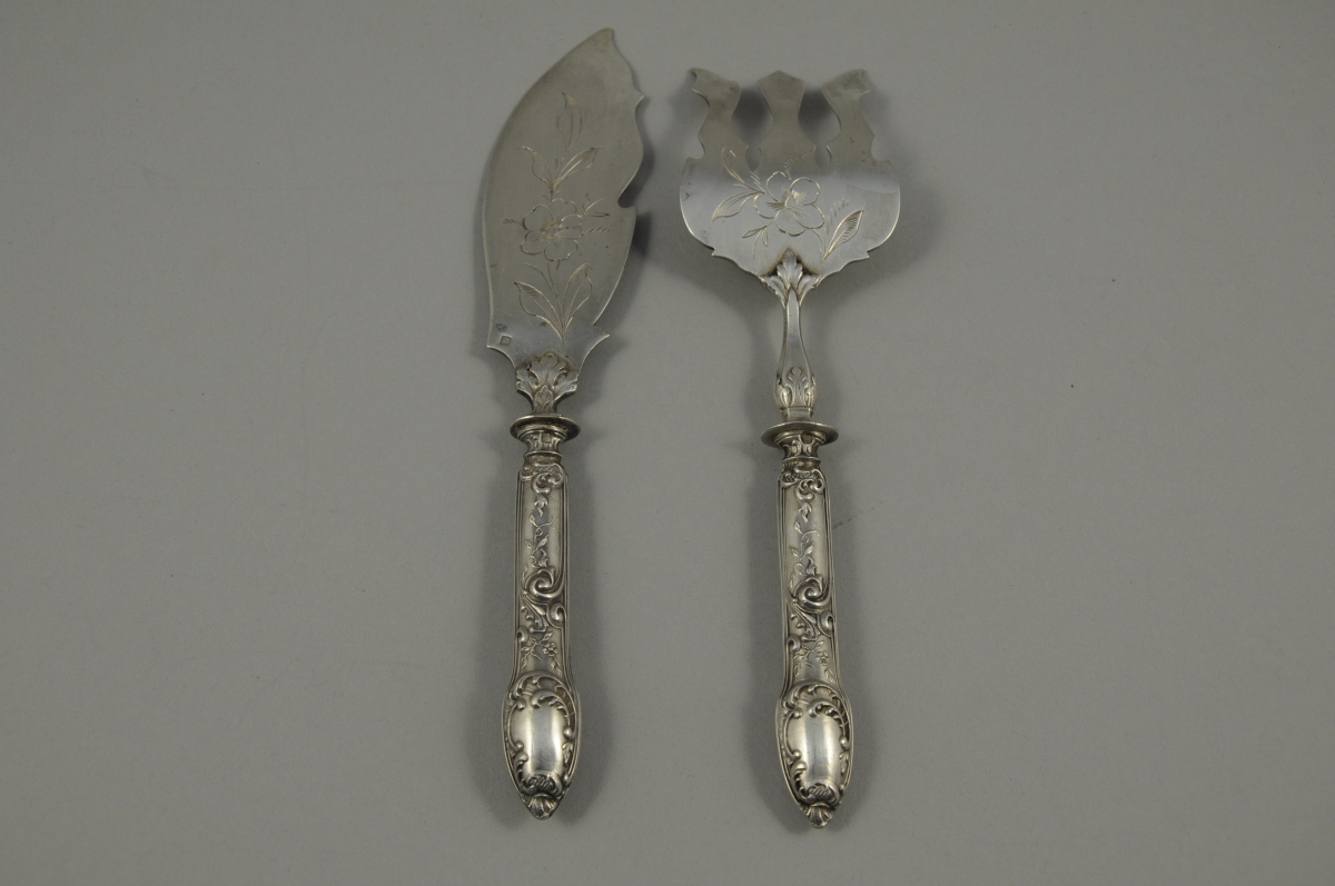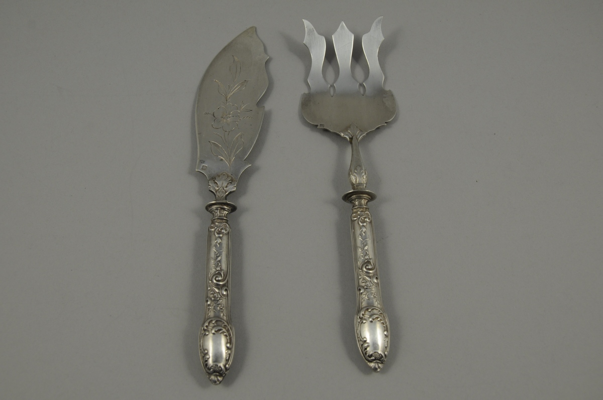 COUVERT de service à poisson. Manches en argent fourré à décor de coquilles et fleurs de style rocaille. Lames ciselées d'une fleur.