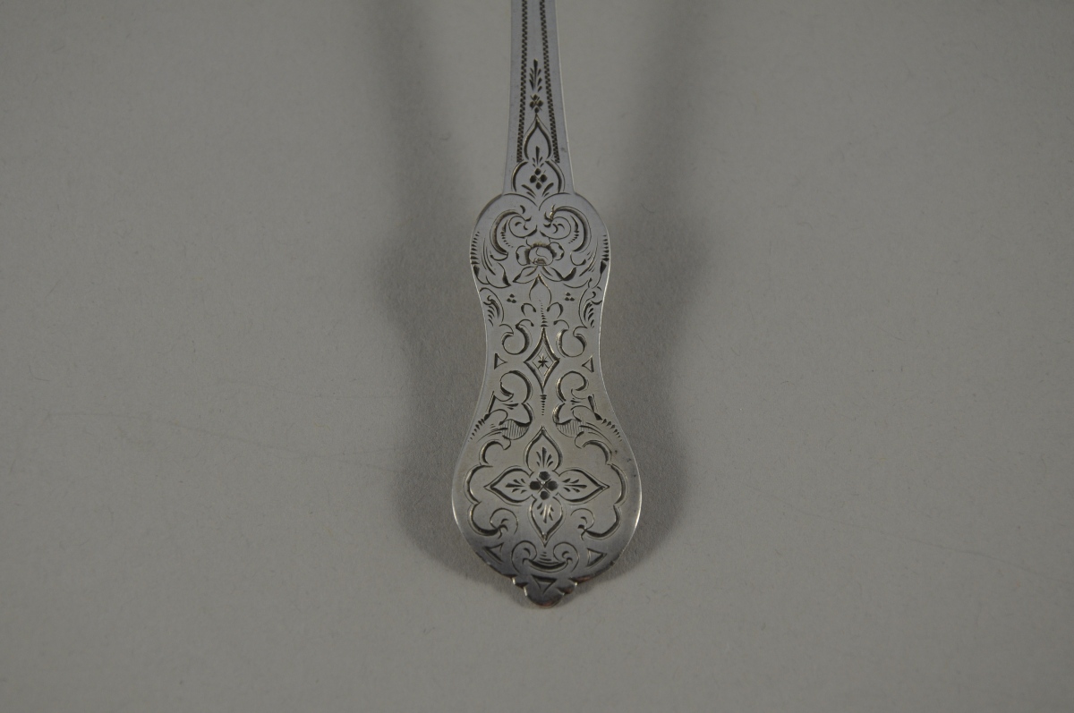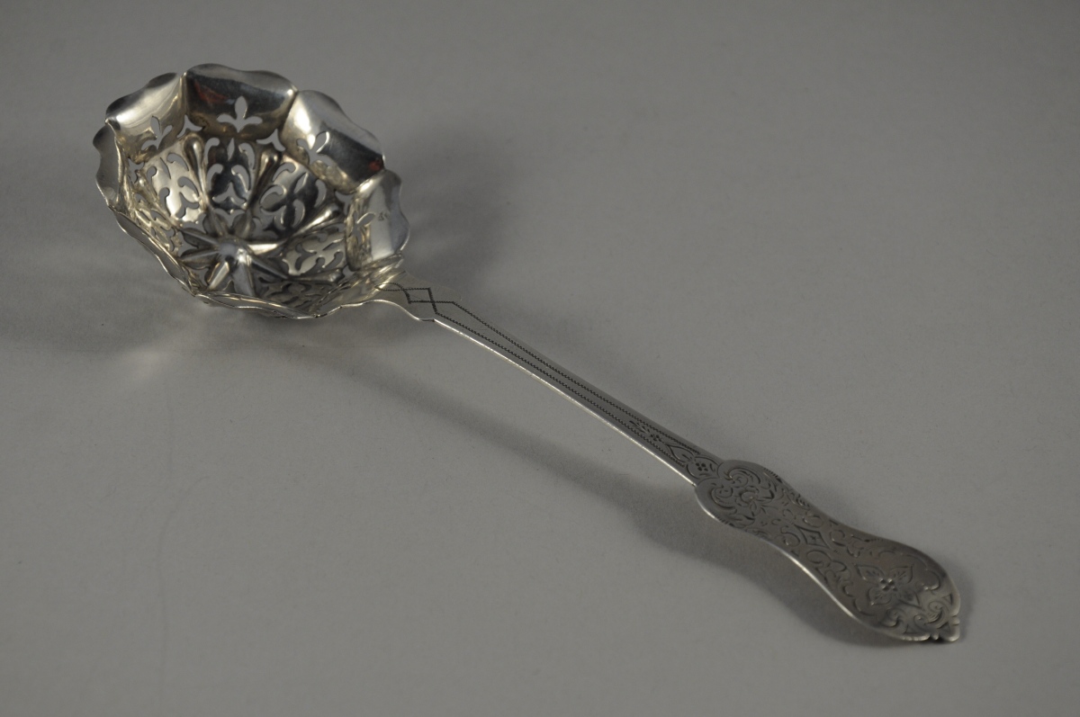 CUILLER saupoudreuse en argent. Manche ciselé de fleurs et volutes. Cuilleron ajouré.
