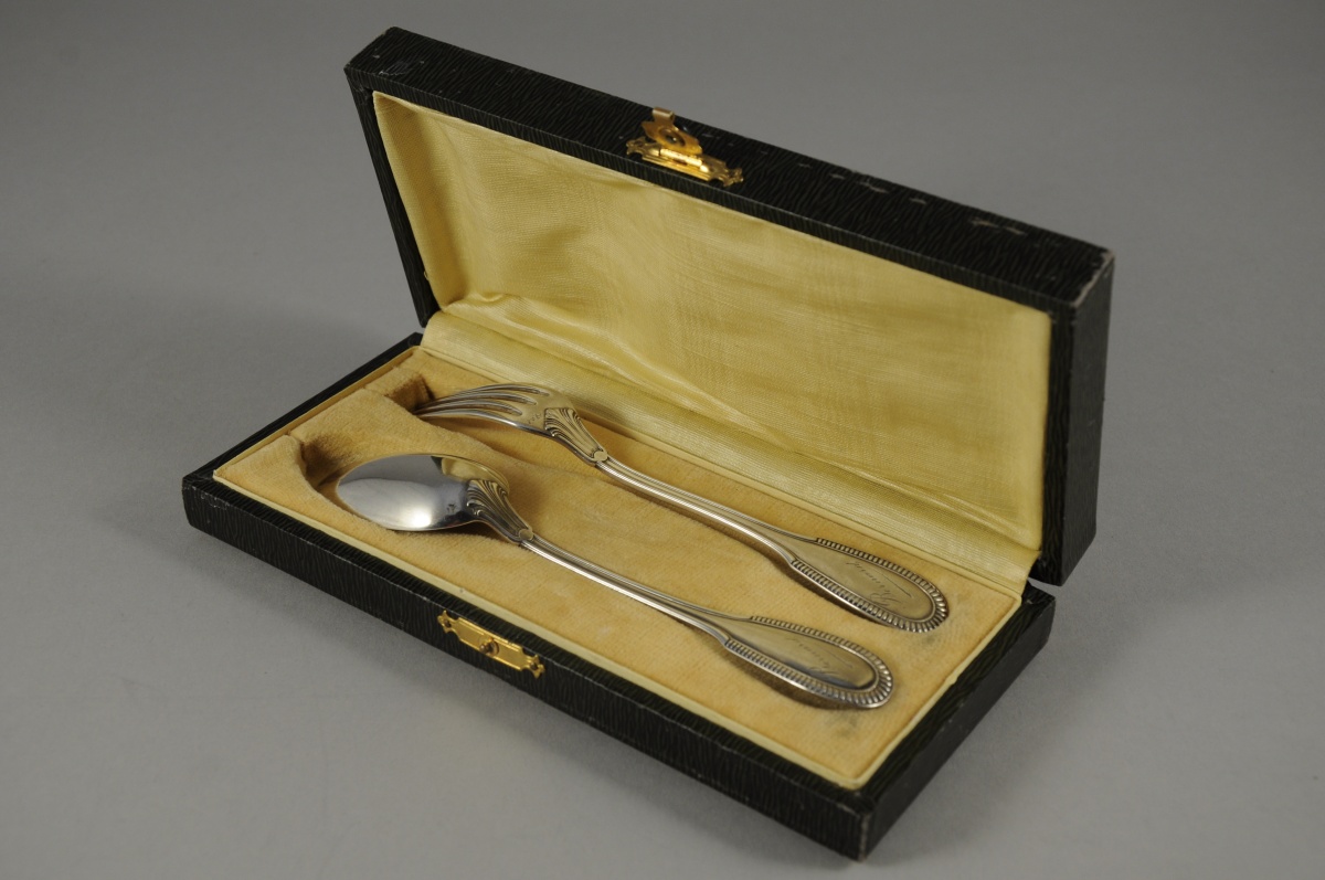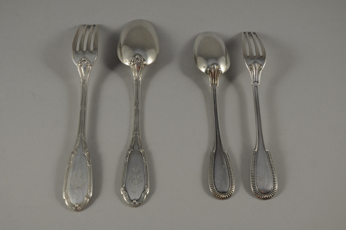 -Un COUVERT en argent. Décor de joncs rubannés et rubans. Ils portent un monogramme.