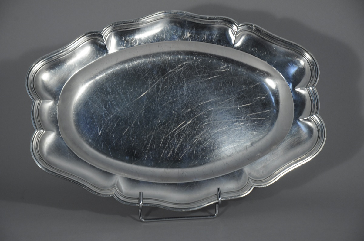 PLAT ovale en argent. Bordure moulurée à contours et marli uni.