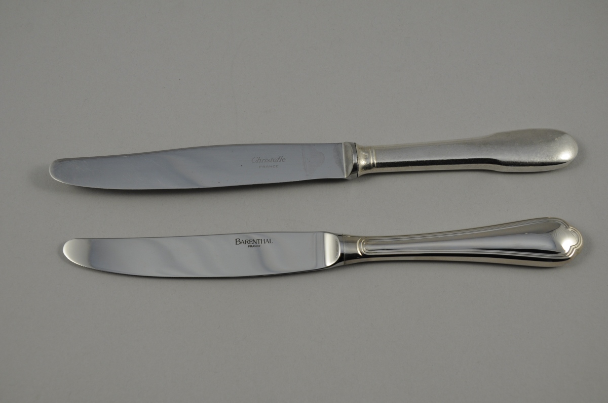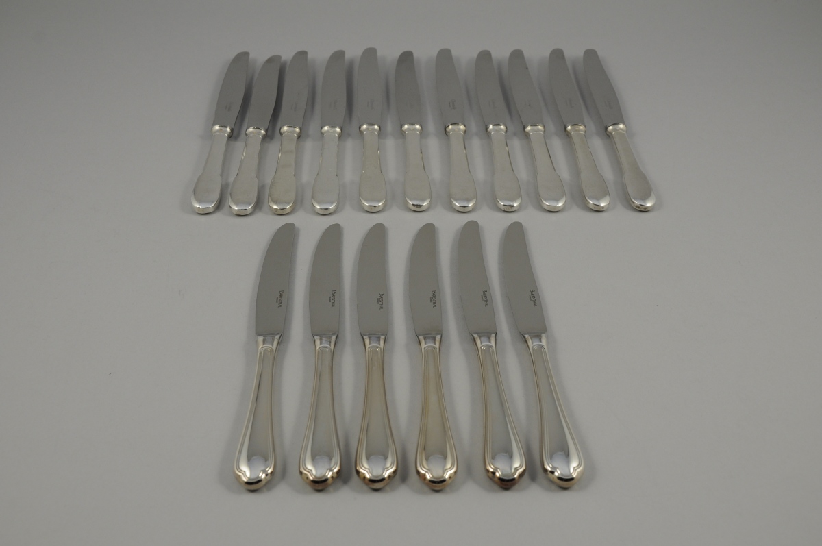 CHRISTOFLE. Suite de onze COUTEAUX, modèle uniplat, en métal argenté. Joint: BARENTHAL. Suite de six couteaux, modèle à contours, en métal argenté et lames en inox.