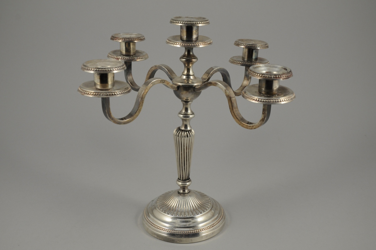 CANDELABRE à 5 lumières en métal argenté. la base circulaire à profil mouluré, à rang de perles et godrons rayonnants. Fût fuselé godroné et bras mouvementés. Binets et bobèches à rang de perles. Haut. 29 cm.