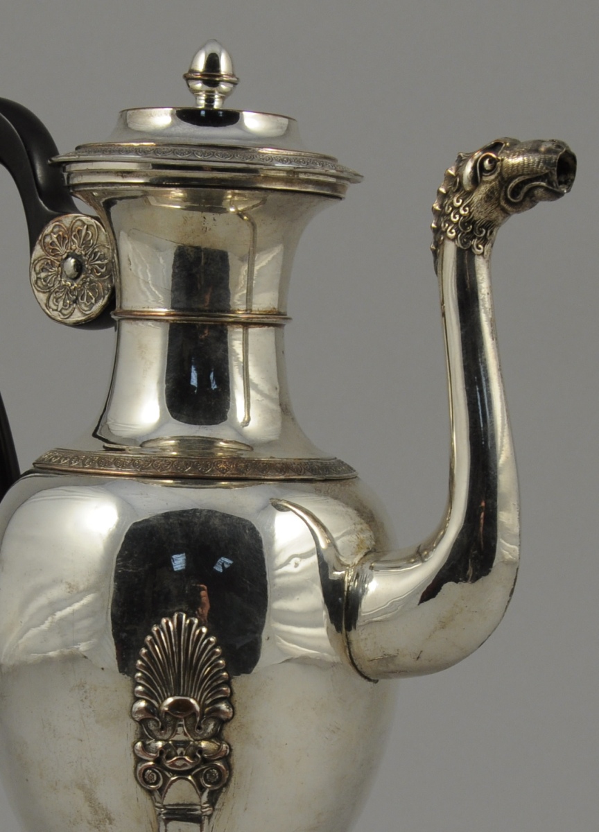 CAFETIÈRE en métal argenté, reposant sur trois pieds terminés en griffes appliqués en palmette, corps ovoïde uni, frises de palmettes à l'épaulement et sur le couvercle, bec verseur anthropomorphe, anse en bois noirci.