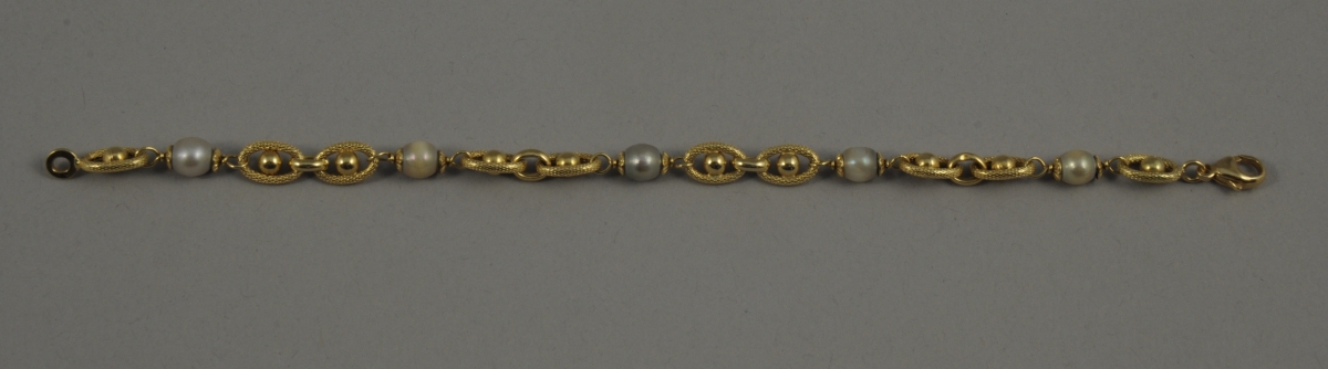 BRACELET en or jaune, anneaux entrelacés et guillochés retenant une boule - avec 5 perles. Poids brut: 8 g.
