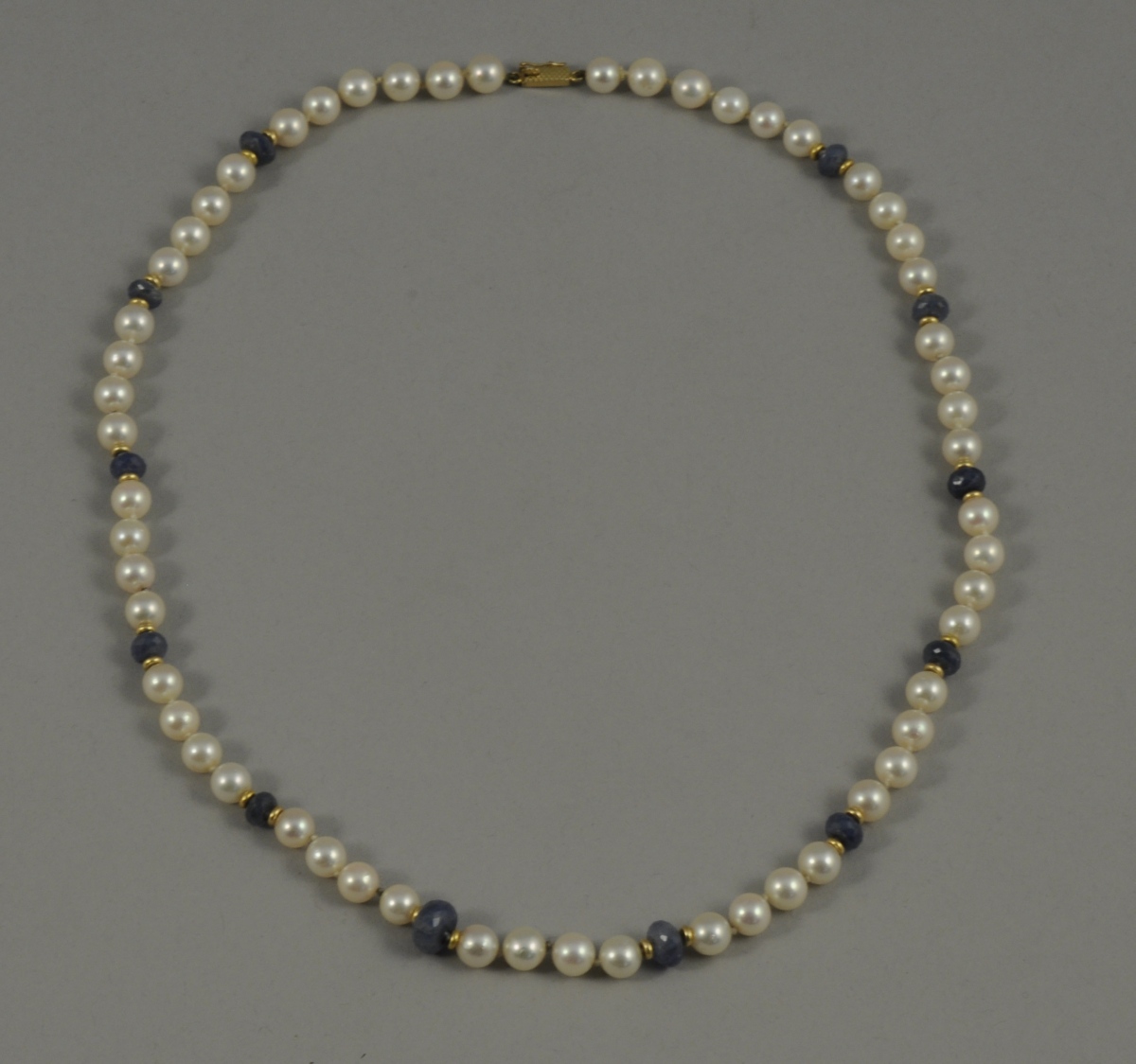 COLLIER SHOKER de 56 perles de cultures intercalées de 12 saphirs. Fermoir en or jaune. Long. 51 cm.