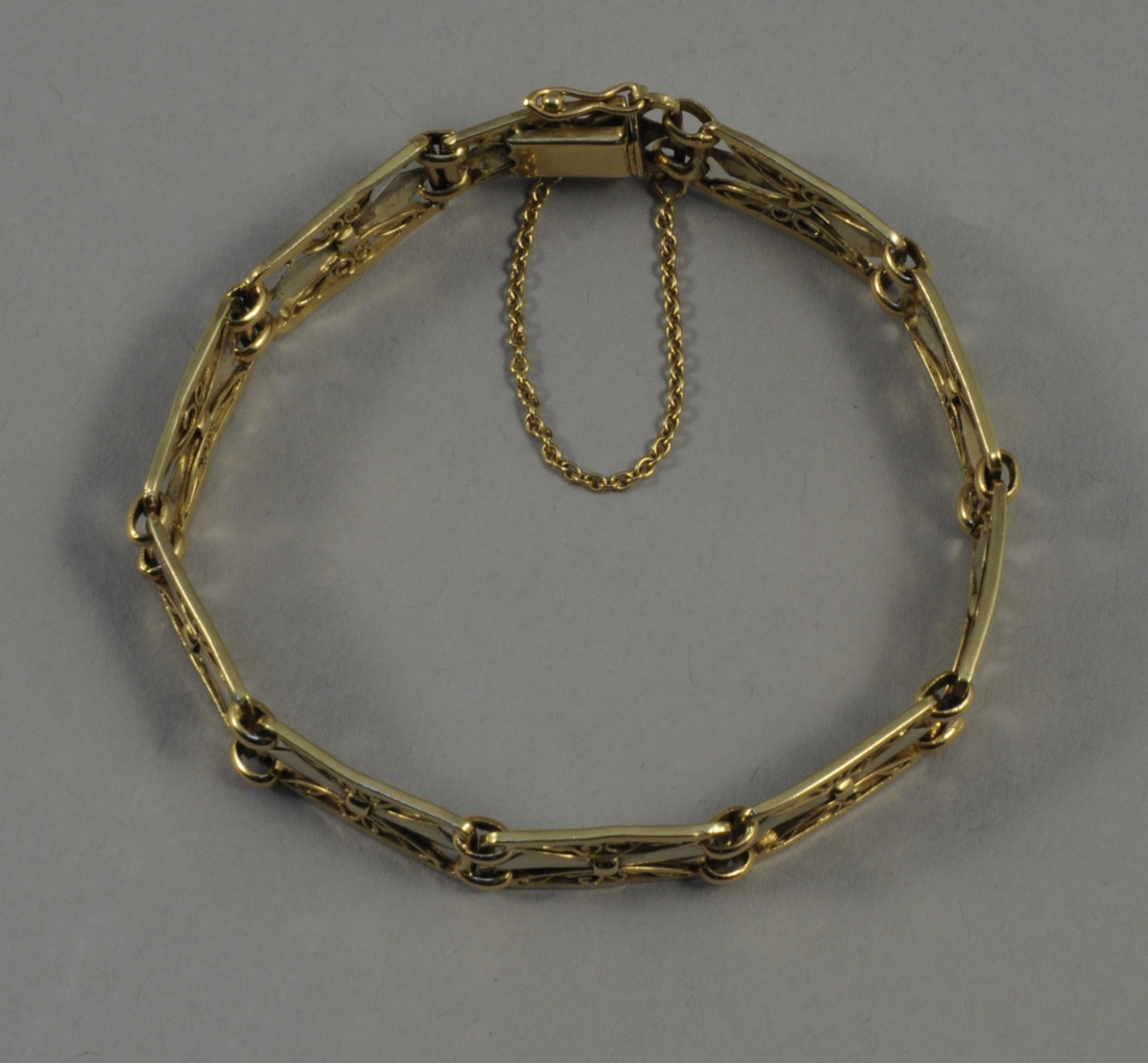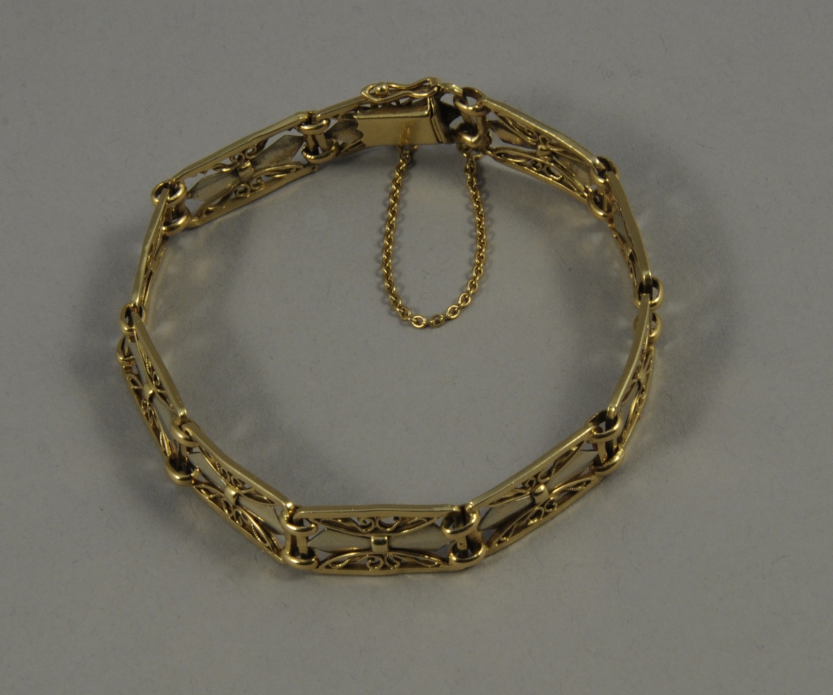 BRACELET en or de deux tons, à motifs rectangulaires enchassant une figure géométrisée dans des enroulement. Long. 19 cm. Poids: 15 g.