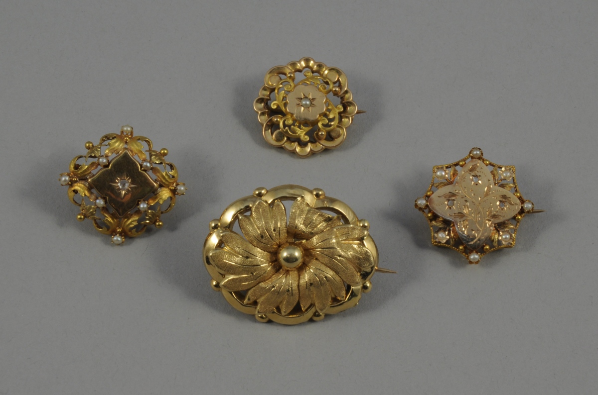 QUATRE BROCHES en or, fin XIXème-début XXème, ornées de feuillages et petites perles. Poids brut: 12g.