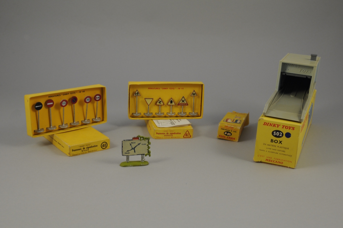 Joint: un panneau de signalisation routière et une boîte vide de poste de ravitaillement.