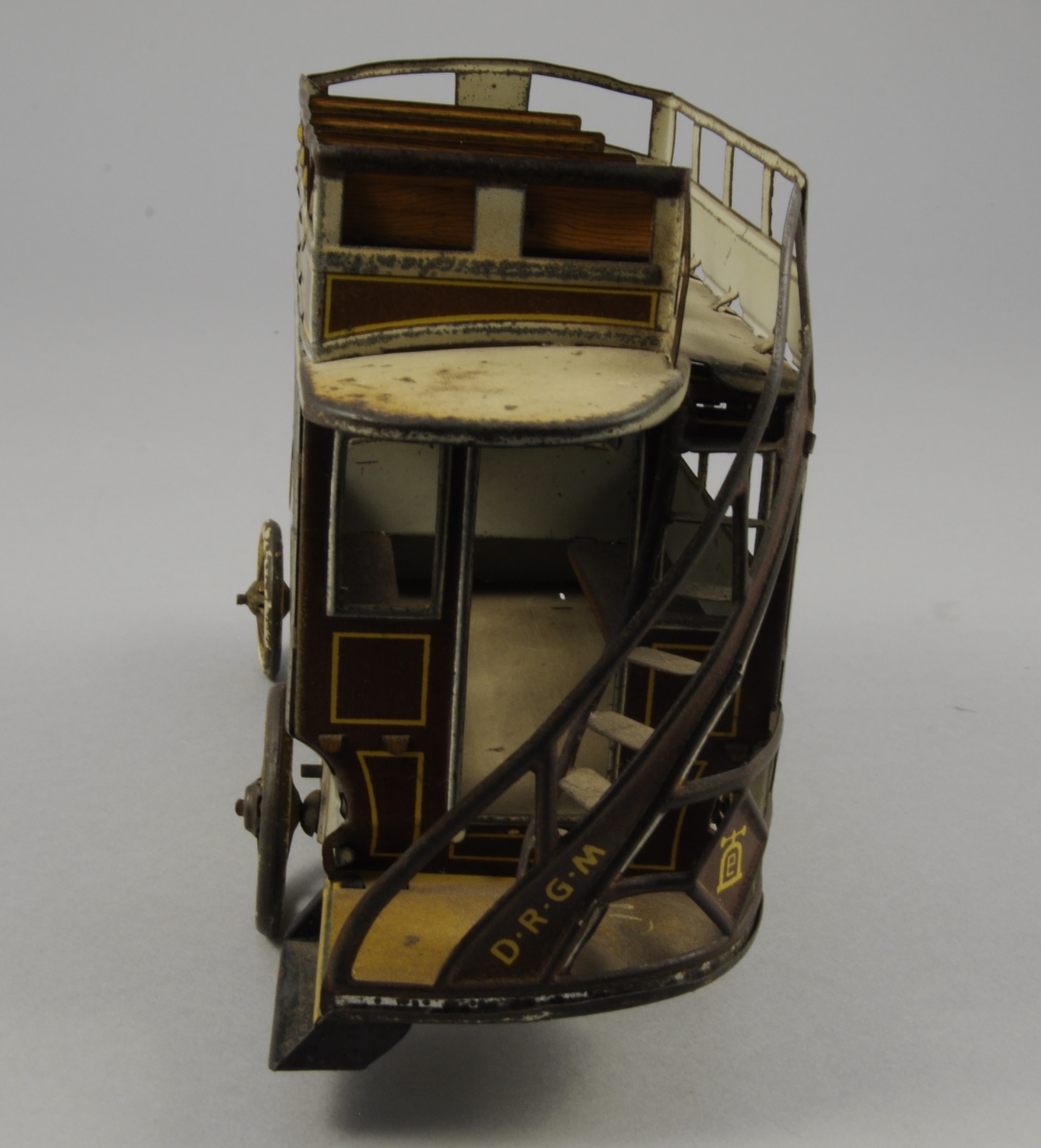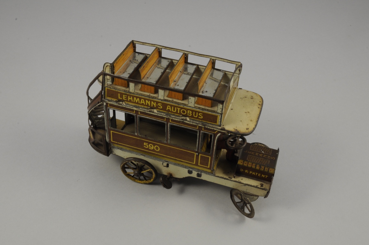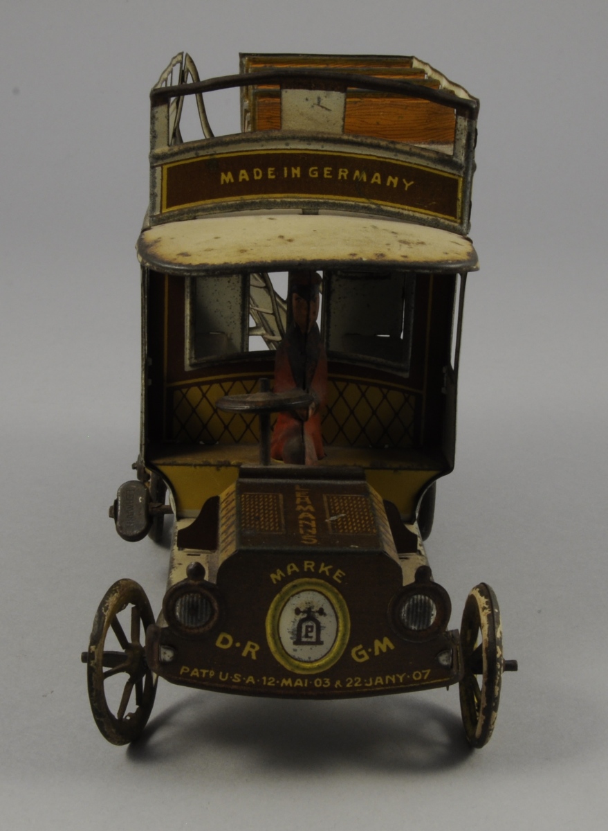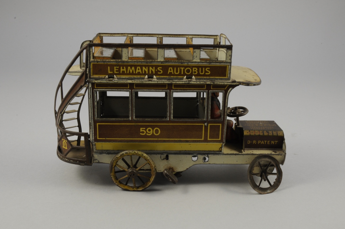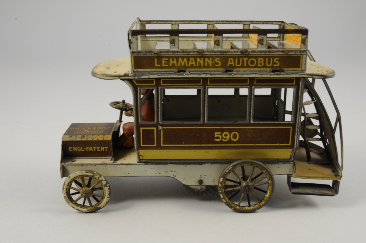 « LEHMANN'S AUTOBUS », (Allemagne, c. 1907). Jouet mécanique représentant un autobus à impériale avec chauffeur couleur jaune et brune. Modèle n°590 de la maison Lehmann. État d'usage (manque une partie de la roue avant droite).