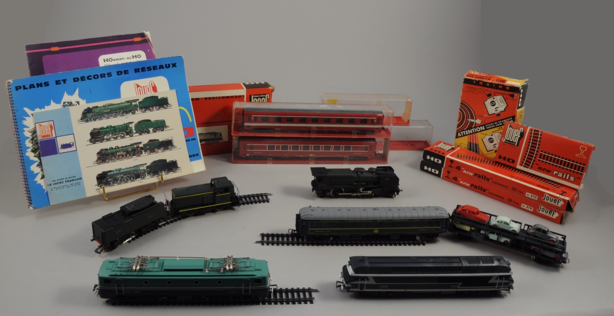JOUEF. TRAIN ÉLECTRIQUE, écartement HO, comprenant: trois coffrets de rails, un transformateur-disjoncteur, quatre voitures, trois locomotives. L'ensemble dans ses boîtes d'origine.