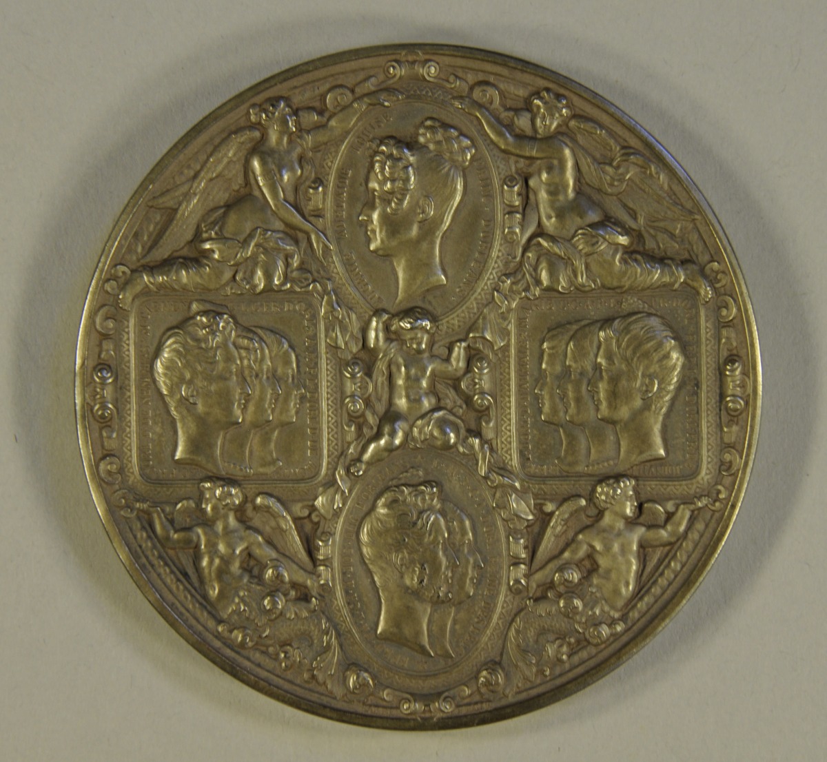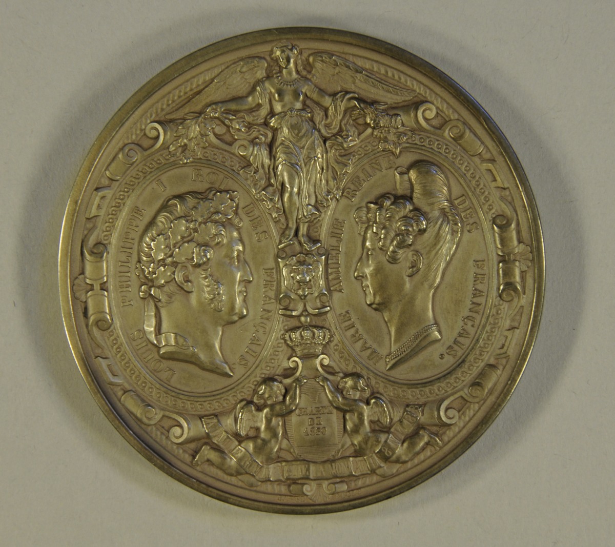 MÉDAILLE commémorative de la visite de LOUIS-PHILIPPE à la Monnaie de Paris en 1833, réalisée par Barre. À l'avers, portraits de Louis-Philippe et de Marie-Amélie dans des médaillons. Au revers, quatre médaillons avec portraits de membres de la famille royale.