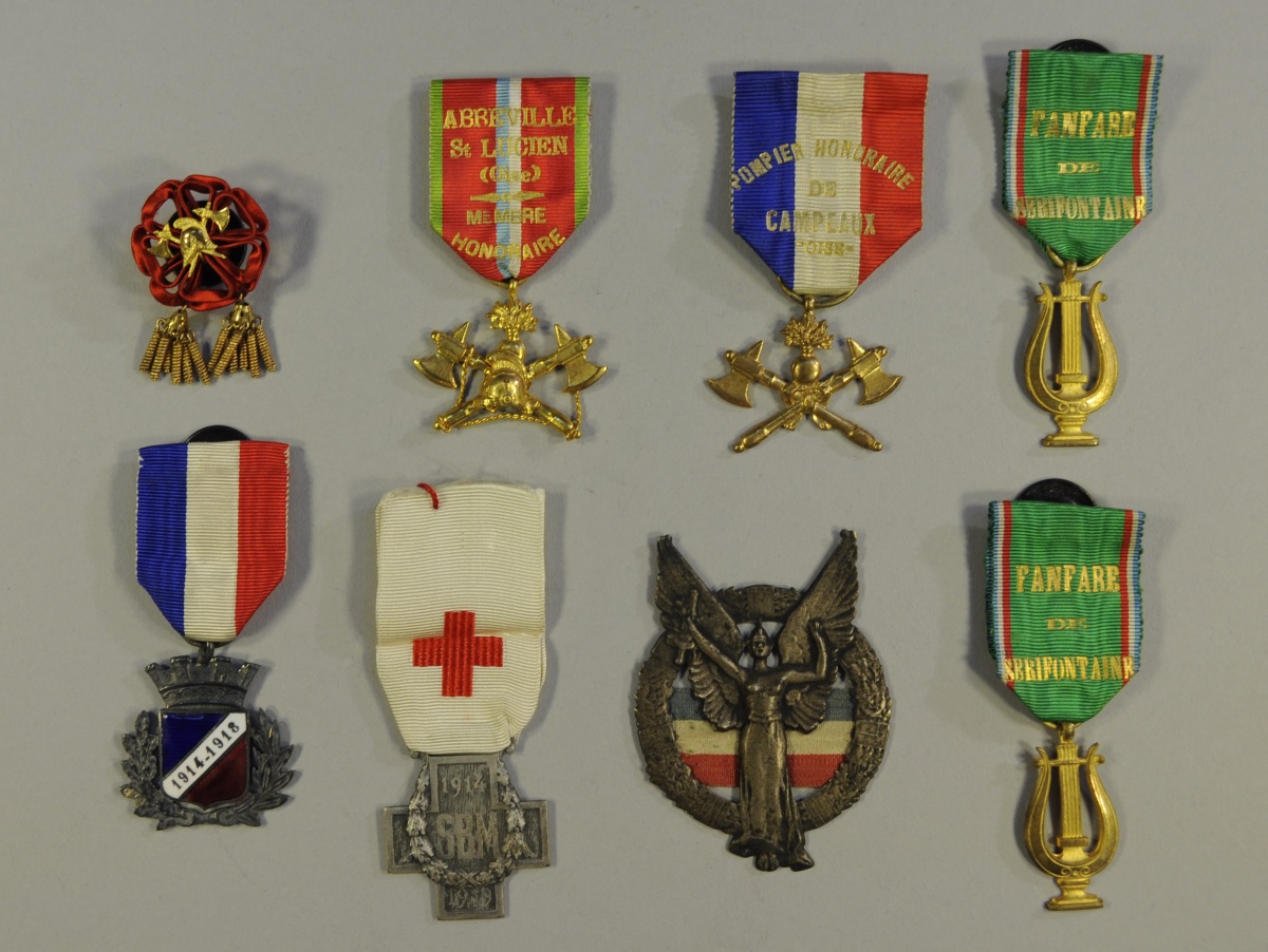 LOT de 7 MÉDAILLES: SBM 1914-1919 (Société française de secours aux blessés militaires des armées de terre et de mer), médaille émaillée marquée 1914-1918, deux médailles marquées sur le ruban "Fanfare de Sérifontaine", trois médailles de sapeurs-pompiers.