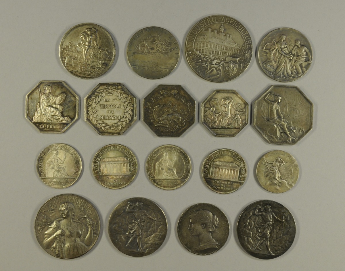 LOT de 18 MÉDAILLES et JETONS de PRÉSENCE en argent sur le thème du commerce.