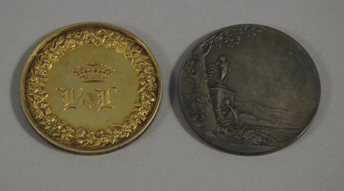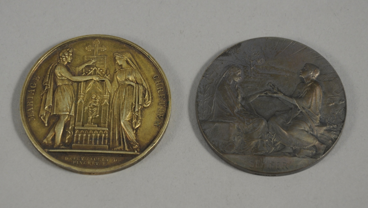 MÉDAILLE de mariage de vermeil. Au recto est figuré un couple se tenant la main devant un autel de style gothique. Signée De Puymaurin D. et Pingret F. Au verso, initiales BL gravées sous une couronne comtale, dans une guirlande de fleurs. Tranche gravée "L.F.M. De La Bouillerie H.A. Destapis 24 Juin 1839".