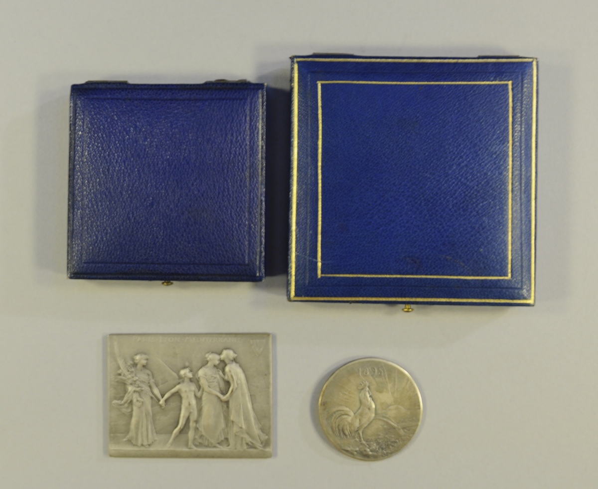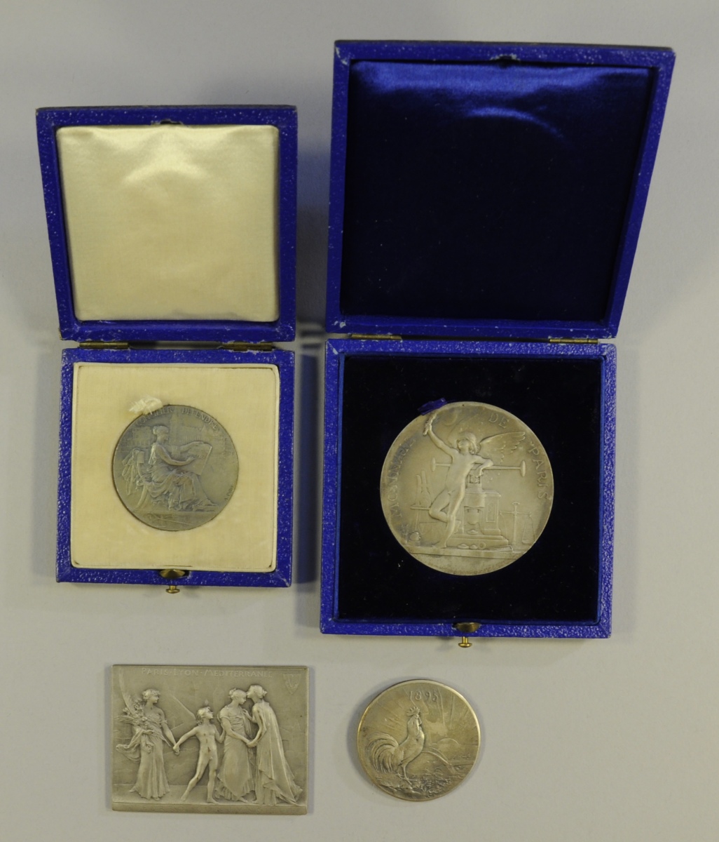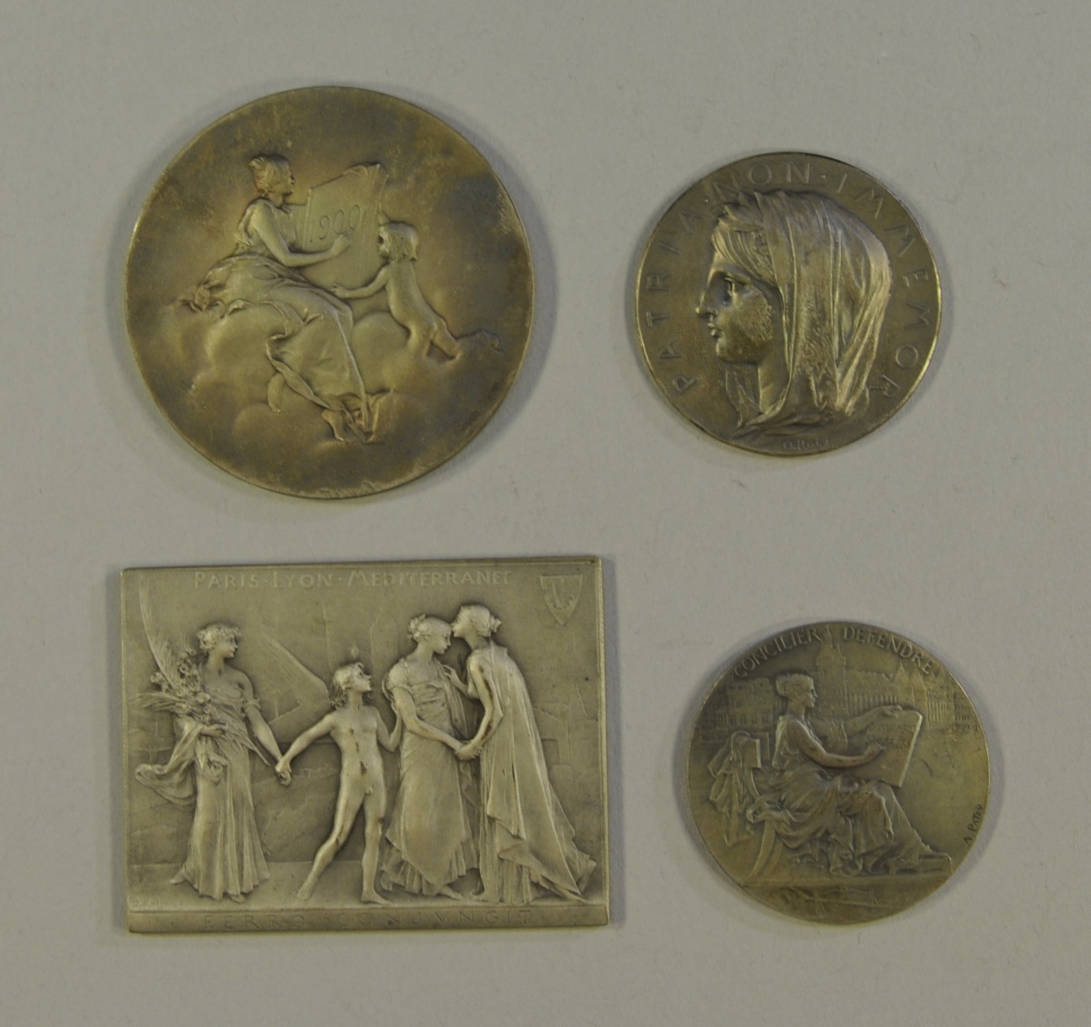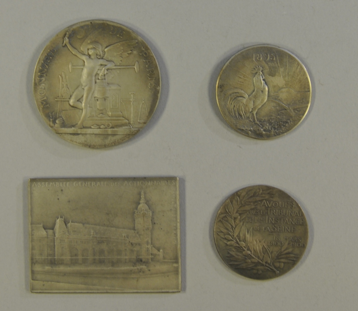 LOT de 4 MÉDAILLES en argent: "Assemblée générale des actionnaires Paris-Lyon-Méditerannée", "Monnaie de Paris 1900", "Patria Non Immemor 1895", "Avoués près le Tribunal de 1ère Instance de la Seine, 1900".