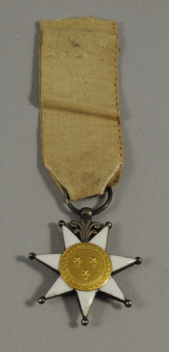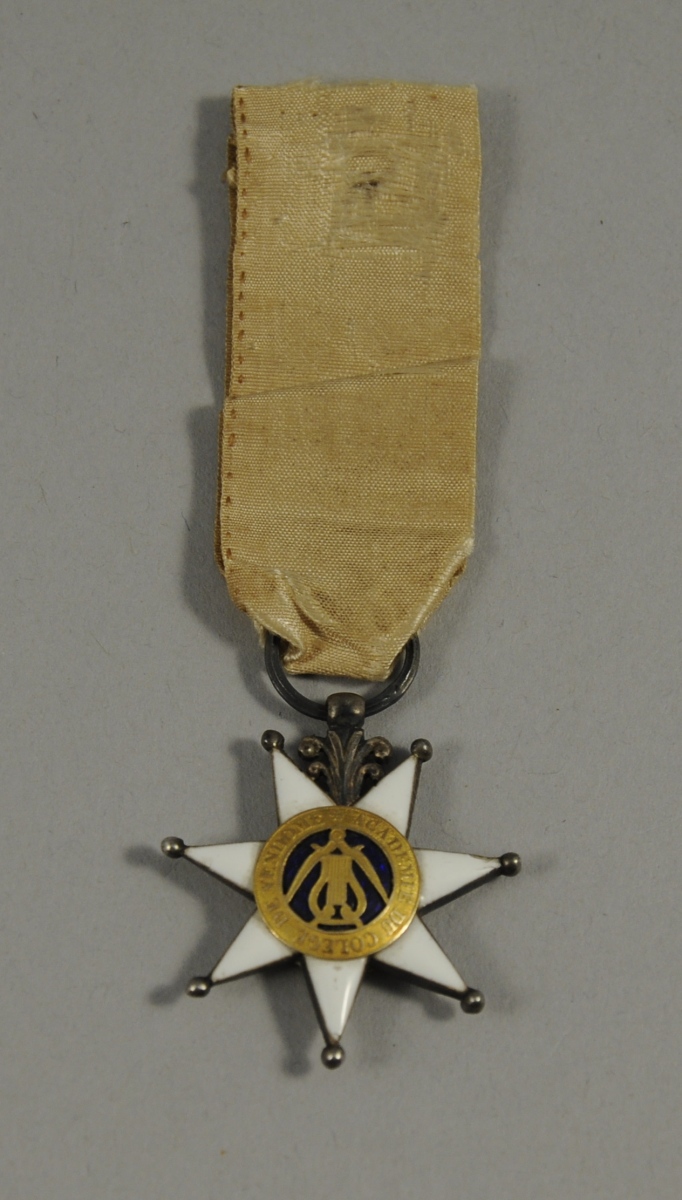 Croix d'argent à 7 pointes émaillées blanc, légèrement pommetées, les branches supérieures cantonnées d'une fleur de lys stylisée. Les centres en deux parties présentent: sur l'avers en or les 3 fleurs de lys sur champ entouré de feuilles de lauriers ; sur le revers, un compas et une lyre en or sur fond émaillé bleu entouré de la légende: ACADEMIE DU COLLEGE DE VENDOME.