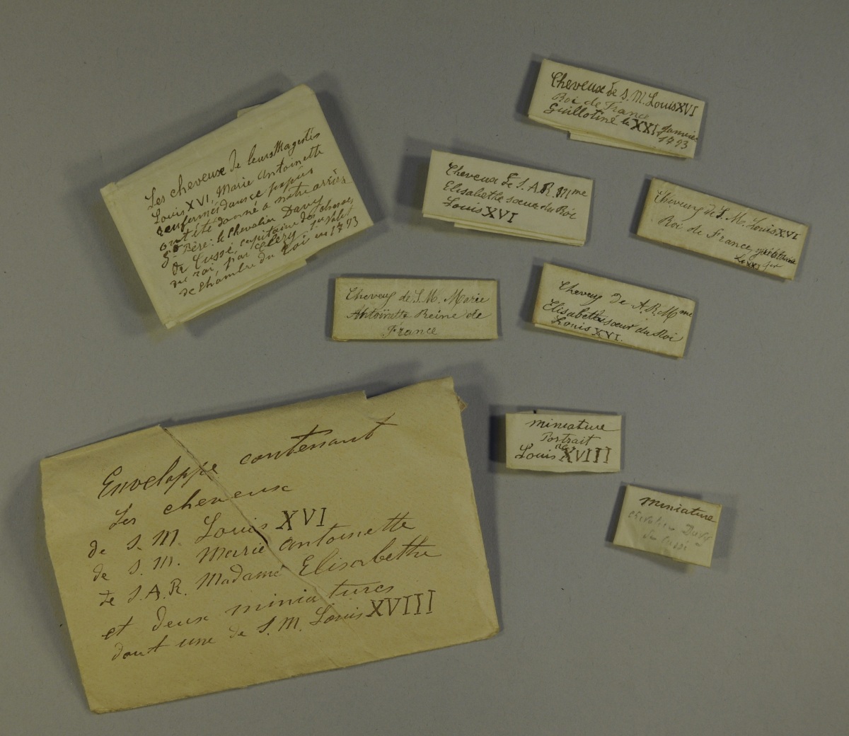 SOUVENIRS HISTORIQUES. Ensemble d'ÉCHANTILLONS de papier contenant des CHEVEUX de Louis XVI, Marie-Antoinette et Madame Elisabeth, ainsi que deux MINIATURES, regroupés dans un papier inscrit "Les cheveux de leurs Majestés Louis XVI, Marie-Antoinette renfermés dans ce papier ont été donné a notre arrière gd-père: le chevalier Davy de Cussé, capitaine des chasses du roi, par Cléry, 1er valet de Chambre du Roi en 1793" (sic):