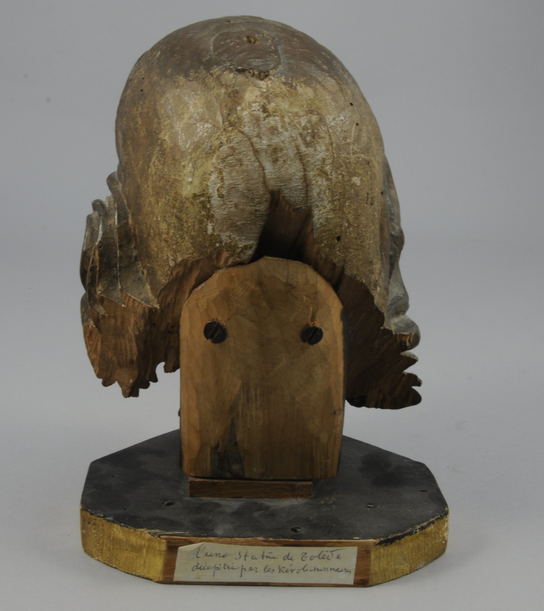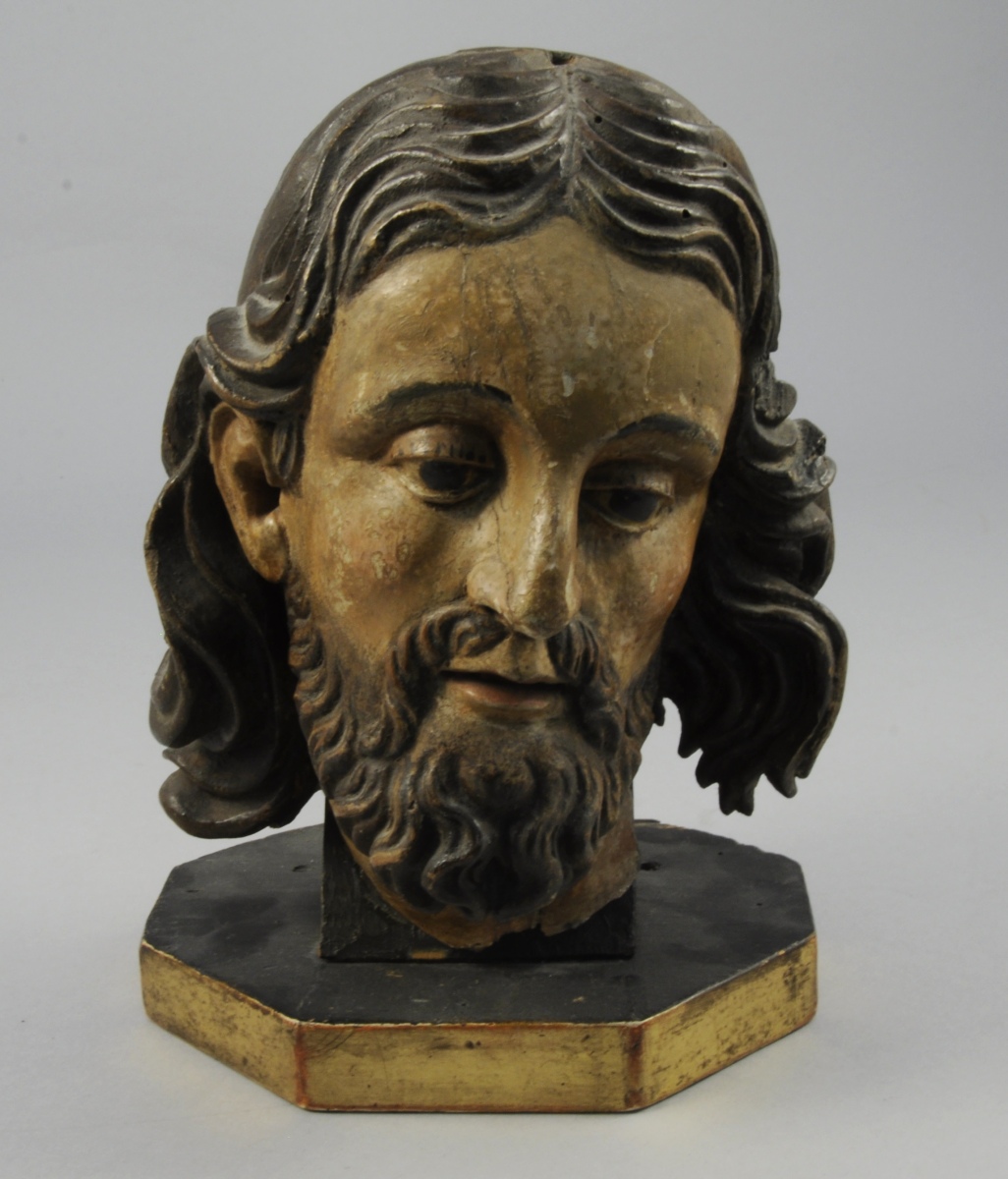 TÊTE du CHRIST. Bois sculpté polychrome. Mention manuscrite sur papier: "D'une statue de Tolède décapitée par les révolutionnaires.
